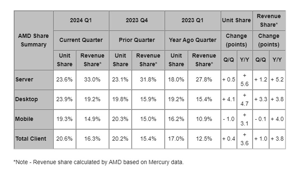 Предполагается, что основными драйверами роста стали процессоры линеек Ryzen 7000 и Ryzen 8000. Примечательно, что на мобильном рынке по сравнению с прошлым кварталом результаты AMD слегка просели.