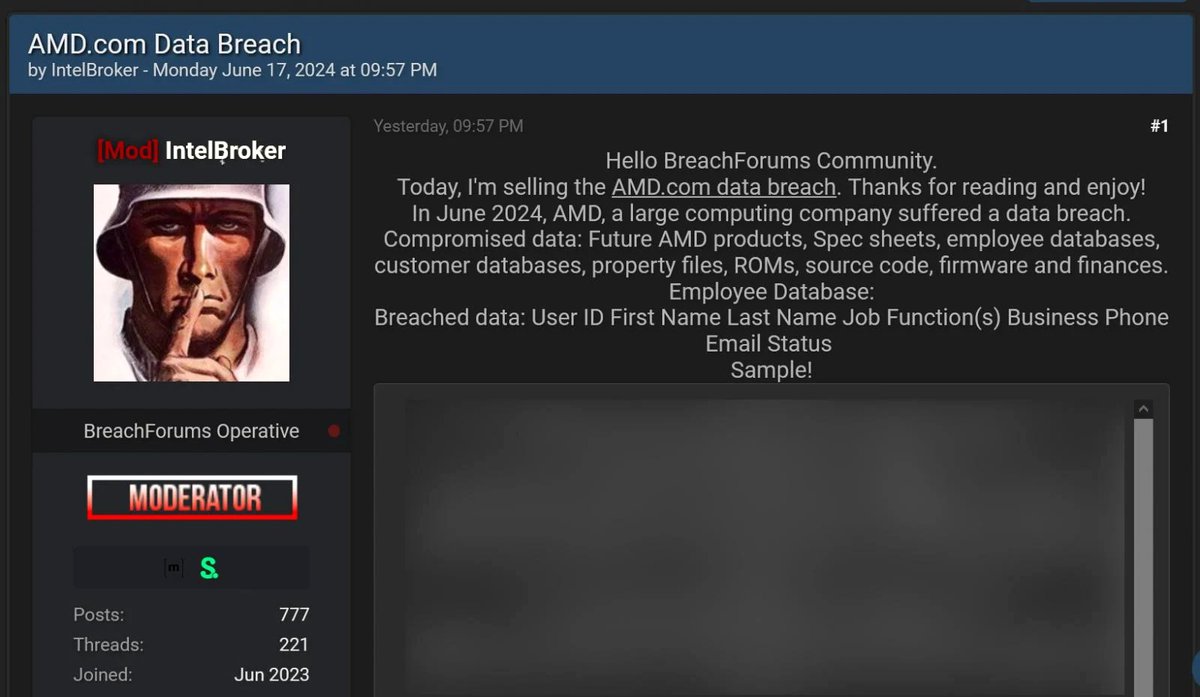 Компания AMD могла стать жертвой хакерской атаки. О краже внутренних данных AMD рассказал хакер IntelBroker, выставивший информацию на продажу.