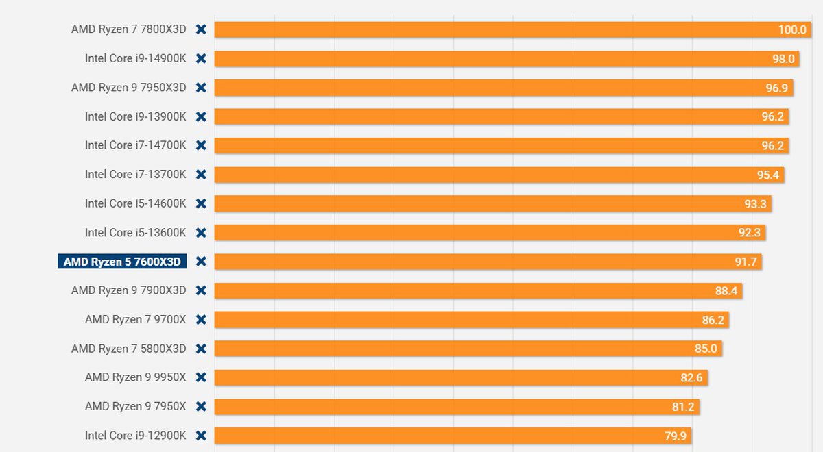 Оказалось, по игровой производительности Ryzen 5 7600X3D превосходит большинство современных процессоров, включая более дорогие флагманы новых поколений. Например, в Cyberpunk 2077 чип быстрее Ryzen 9 7950X3D и нового Ryzen 7 9700X.