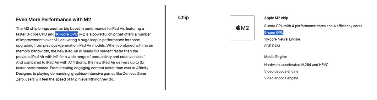 Интересный момент: характеристики iPad Air изменились уже после старта продаж. Мы пока не знаем, всегда ли Apple продавала планшет с 9-ядерным GPU под видом 10-ядерного или урезанный чип появился только в новых партиях устройств.