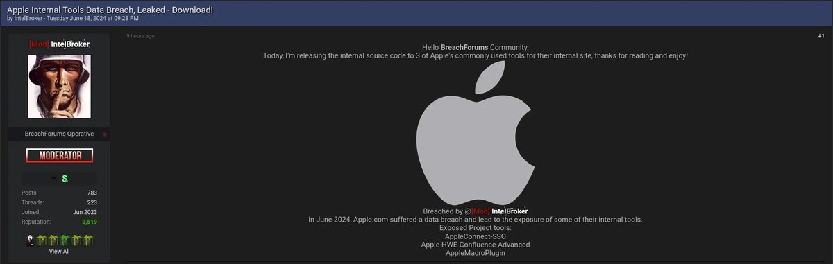 Хакер Intelbroker, в середине недели сообщивший о взломе компании AMD (позже атака была подтверждена), якобы взломал еще одну крупную компанию — Apple. Утверждается, что в результате взлома удалось похитить внутренние инструменты компании.