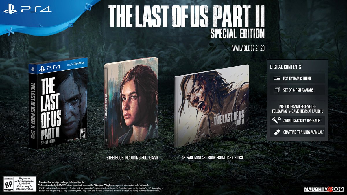 У игры будет пять изданий: стандартное, Digital Deluxe, специальное, коллекционное, Ellie Edition. У обычного издания практически нет бонусов, только подарки за предзаказ и специальный аватар. Владельцы Digital Deluxe получат саундтрек и мини-артбук.