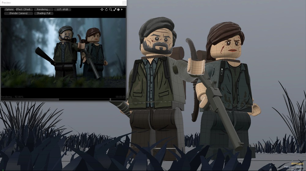 Все фигурки не настоящие и существуют только в виде трехмерных моделей. Вот как выглядит процесс их создания: ниже первый кадр это готовое изображение, следом показаны текстуры и модели во время настройки сцены.