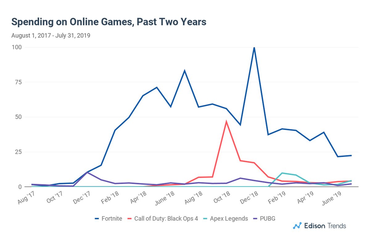Интересно, что в октябре 2018 года Fortnite едва не догнала только что вышедшая Call of Duty Black Ops 4. Популярности у игры хватило всего на несколько месяцев, уже к началу 2019 года ее показатели упали до уровня PUBG.