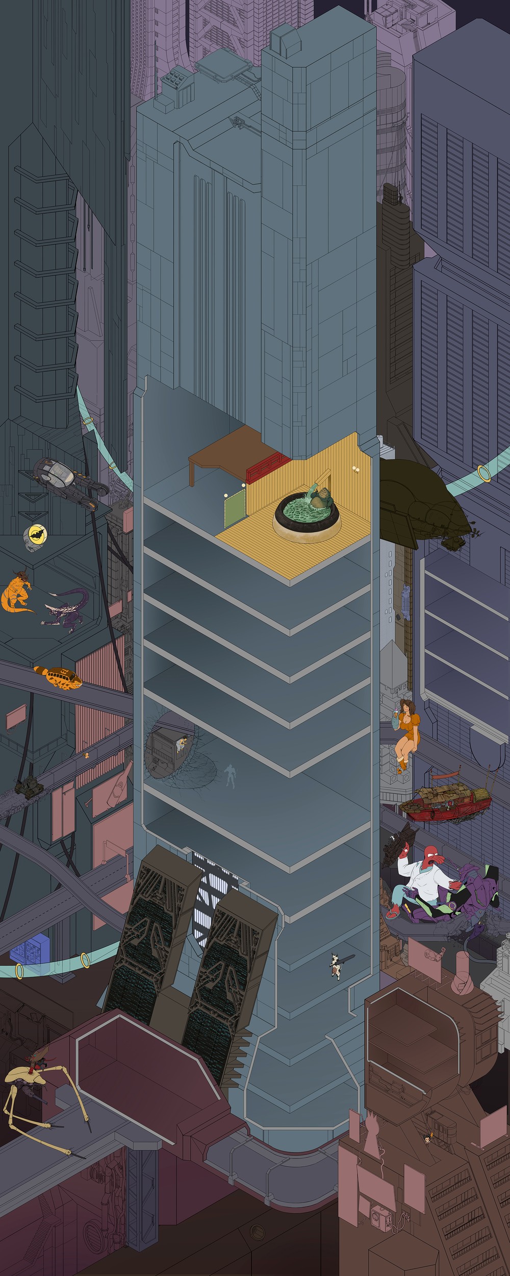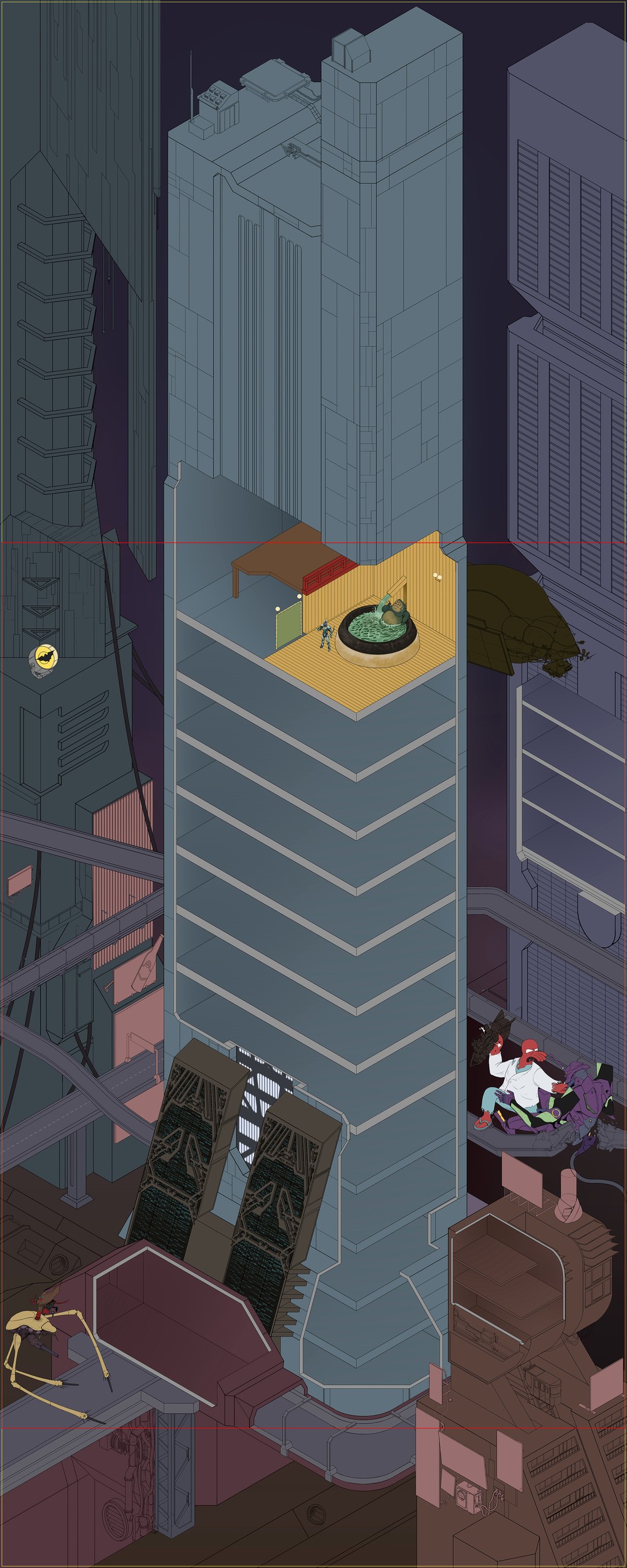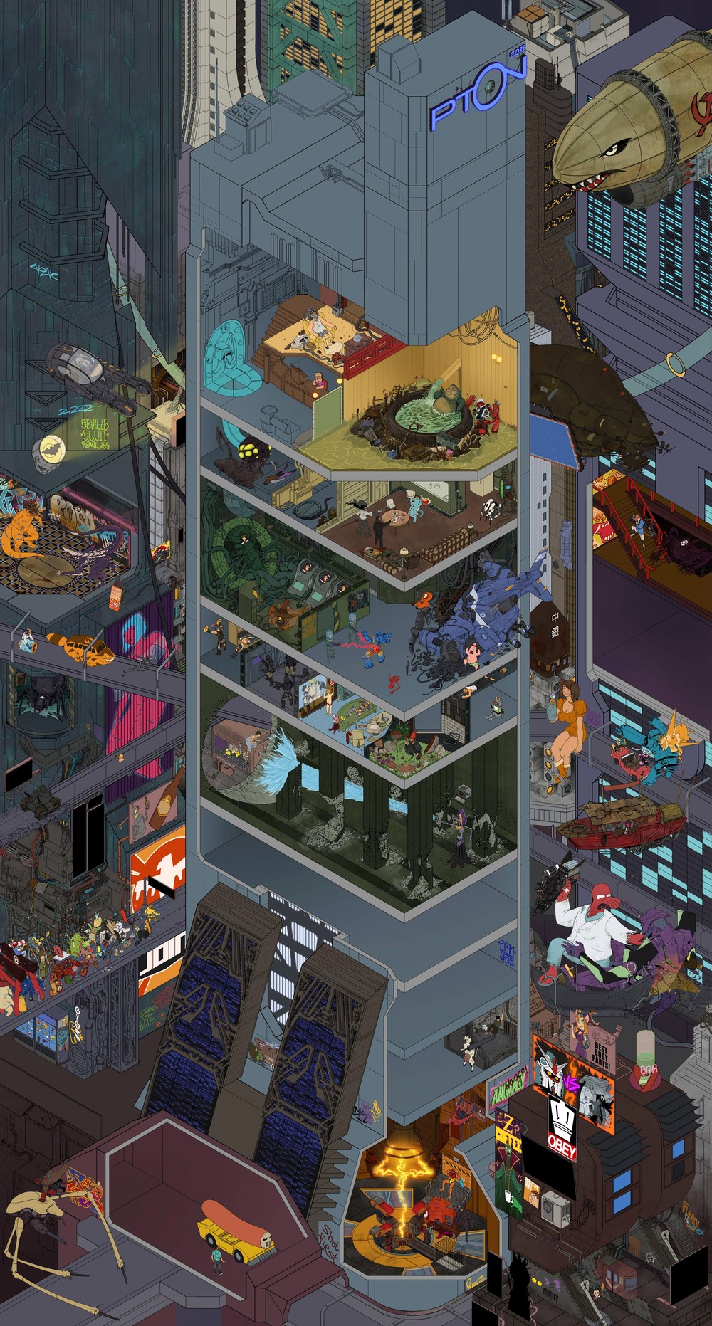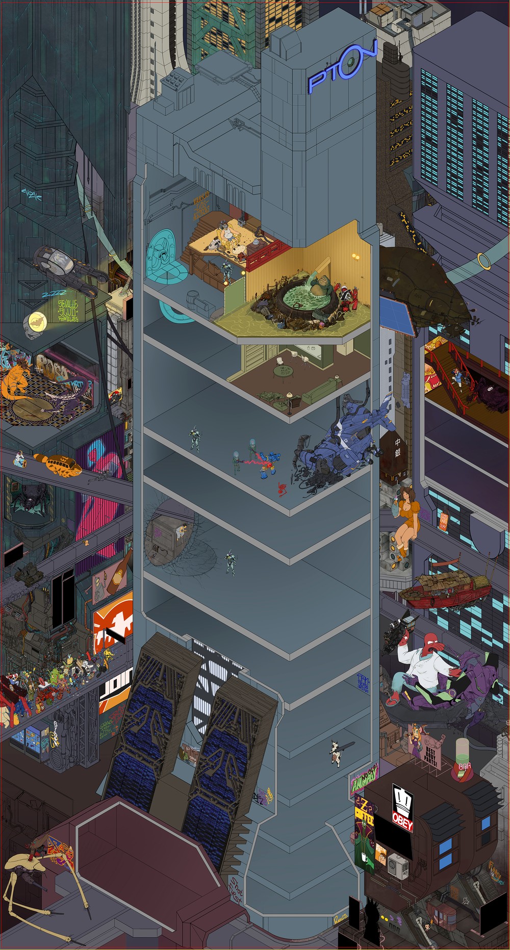 Помимо финального плаката художник выложил несколько промежуточных версий арта. Тут можно увидеть, как в гигантском здании постепенно появлялись этажи и заселялись новые герои; еще больше таких артов собрано здесь.