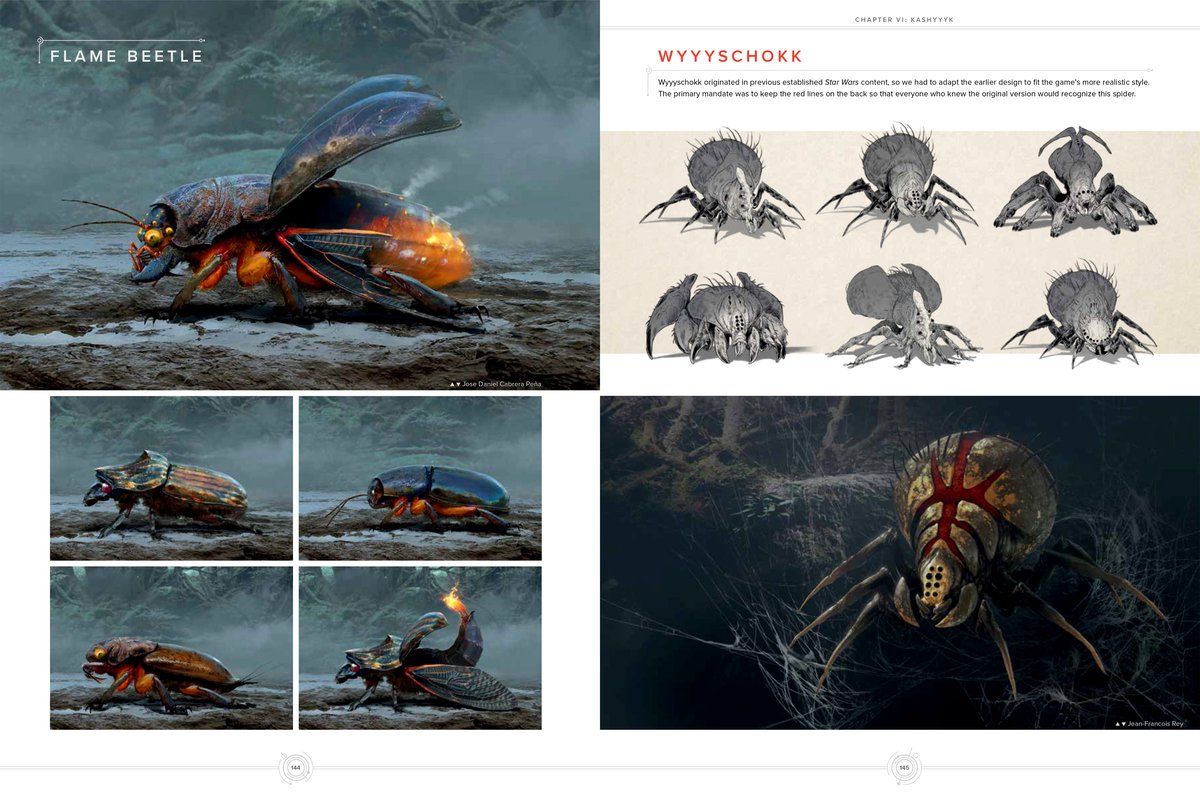 На первой странице показан огненный жук и паукообразное существо Wyyyschokk, обитающее на Кашиике. Как пишут разработчики, такие пауки появлялись во вселенной «Звездных войн» и прежде; для Fallen Order их дизайн немного изменили, сделав существ более реалистичными.