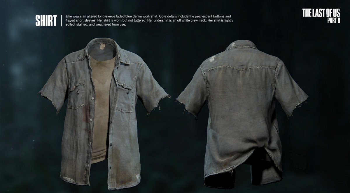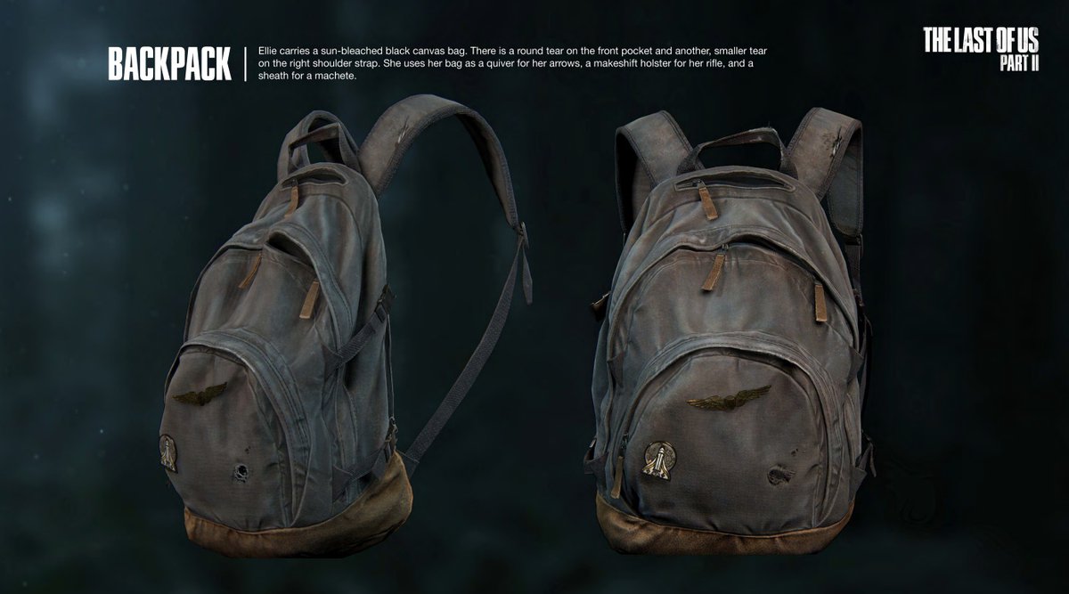 Из описаний можно узнать, что на одежде Элли должны быть застиранные пятна крови, а ее рюкзак максимально функционален: он используется одновременно и как колчан, и как заплечная кобура для винтовки. На самом рюкзаке есть два значка: один в виде золотых крыльев, другой в виде шаттла, парящего над землей.