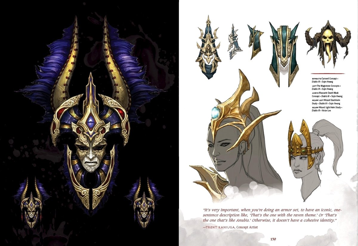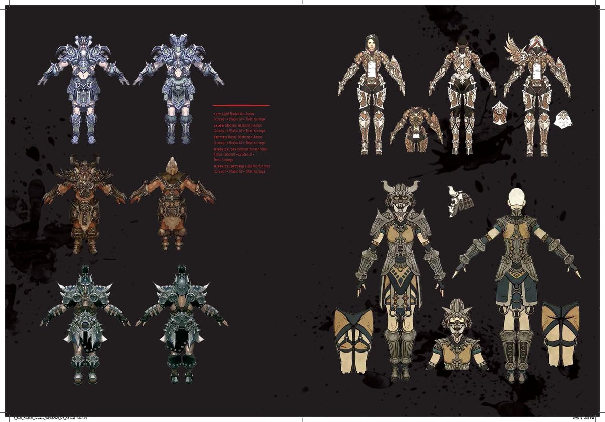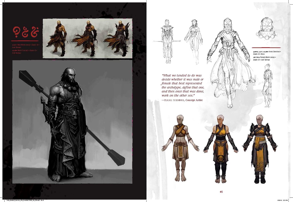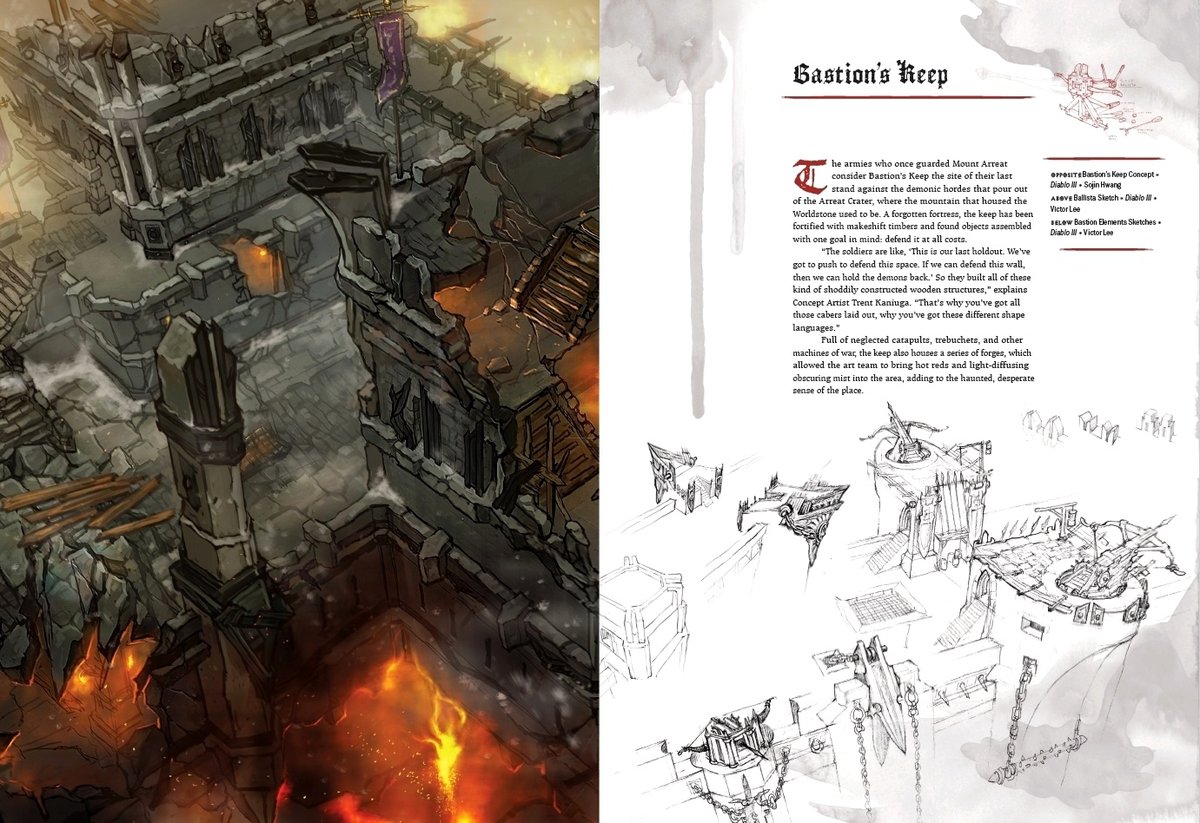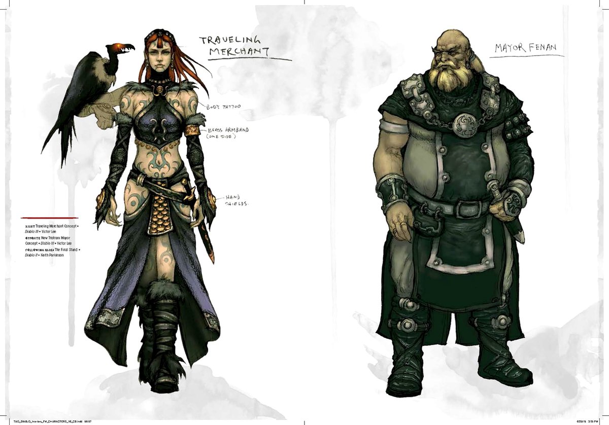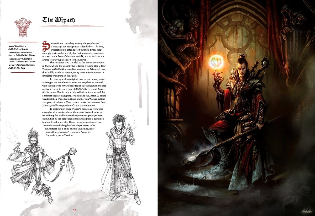 Опубликованные страницы рассказывают о нескольких локациях и персонажах Diablo. Варвар, например, был вдохновлен Конаном-варваром, а при создании образа Тираэля художники добавляли детали, указывающие на то, что это не совсем обычный ангел — Тираэль не из тех, кто будет держать вас за руки и успокаивать.