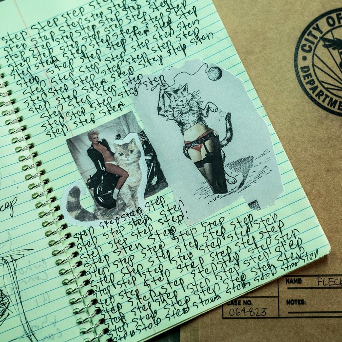 В промежутках между бесконечными «step» — их писал сам Хоакин Феникс, исполнитель главной роли, — Джокер вклеил в свой дневник несколько коллажей. Это фотографии женщин, к которым добавлены фрагменты тел кошек.