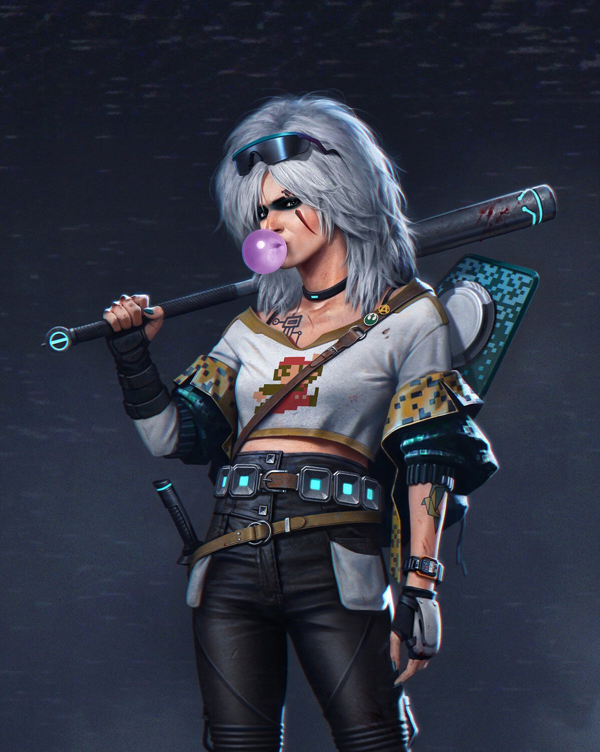 Психоделические цвета в образе Цири сочетаются с необычной экипировкой, безумными татуировками, микрочипами и странным оружием. В результате Цири удачно передает дух времени. А еще тут есть Марио и «Звездные войны».