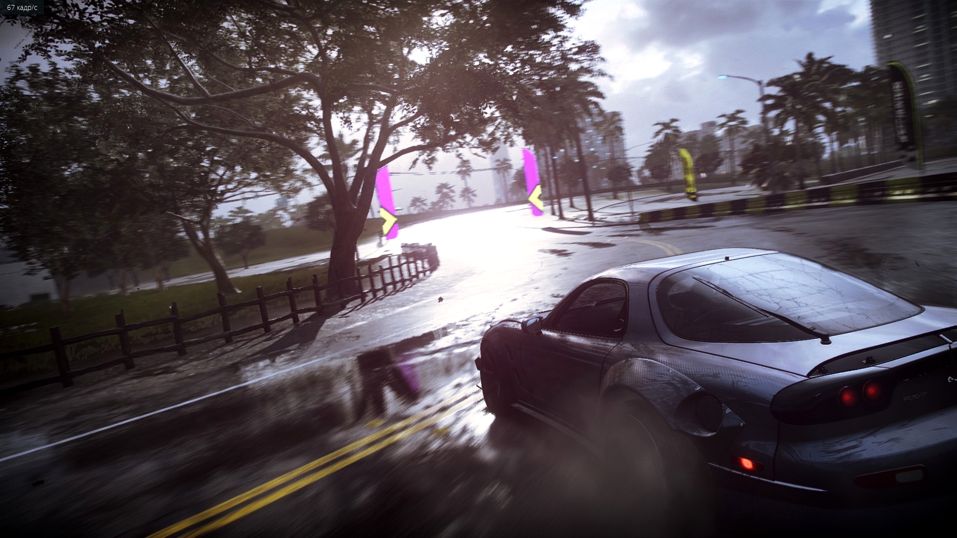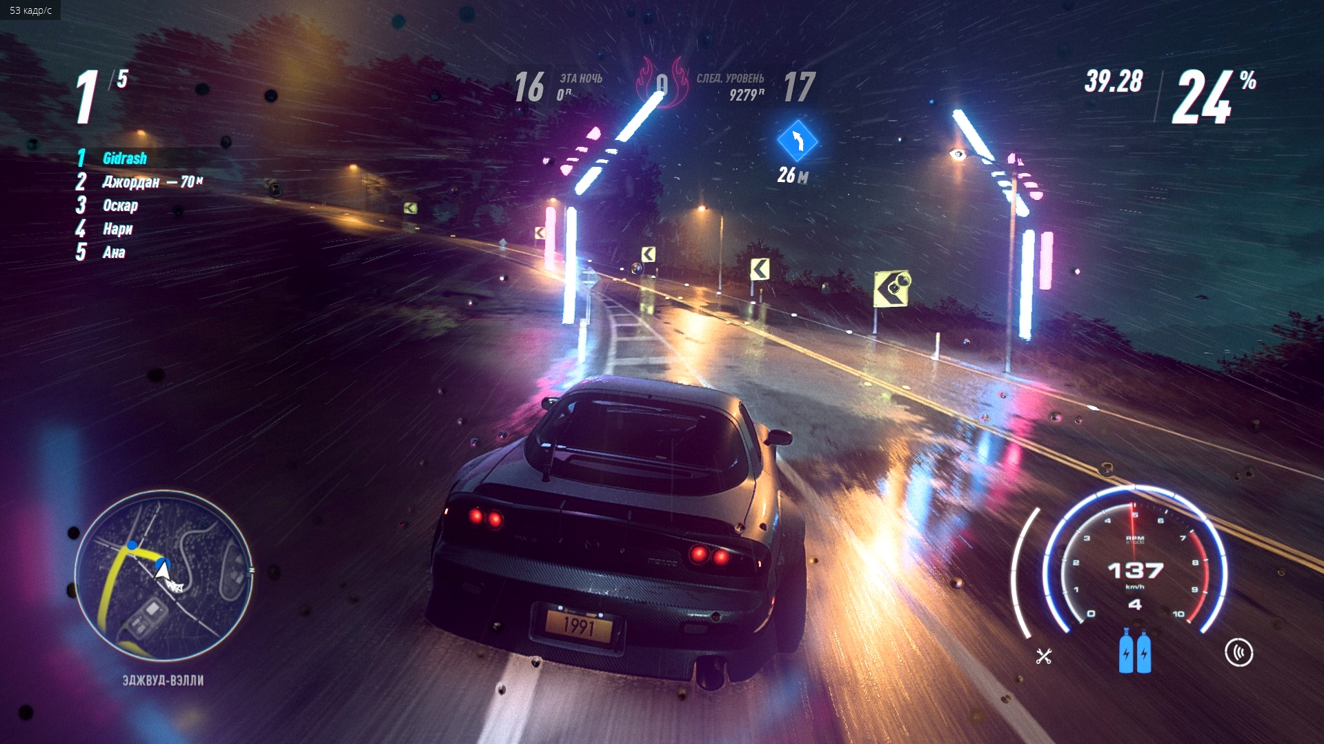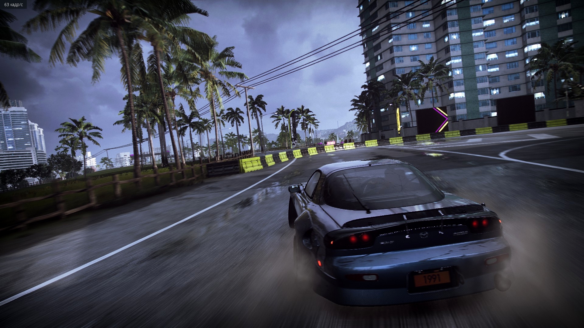 Пусть наш путь начнется с чашечки кофе, за которой обсудим визуал игры. Честно, не хочу мусолить тему красоты меняющих друг друга пикселей, но не сказать ничего не могу. Графика в игре есть, не ох и ах, но вполне достойная для жанра. Примерно тот же PayBack. В угоду разнообразию выполнена смена с пустынных локаций Фортуна-Вэлли на зеленый мир округа Палм-Сити в котором есть леса, болота, луга, реки и утопающий в море неона город. А так же дождь. Признаться я скептически относился к идее динамической погоды в игре т.к. полагал, что какой-нибудь помешанный дизайнер зафигачит бесконечный дождь ради фапаса на мокрые тачки, мокрый асфальт, мокрую игру... И знаешь, это так и не так одновременно (биполярочка, ага). Дождь - явление довольно частое, но не на столько, чтобы от него воротило. Изменение погоды днем сопровождается контрастной пред/после дождевой гаммой, что приятно. Ночь особо хороша и без дождя, а в непогоду окружение сверкает ярче елки на новый год. Катая за городом я не раз ловил лютые флешбеки к временам NFSU2, особенно на извилистых горных поворотах. Антураж и атмосфера мира создают возможность для получения шикарных кадров, но отсутствие фоторежима в игре (какого вообще, как мне делать обоины на рабочий стол а, EA???) не дает заделать особо качественных картинок в пример, что получается по кнопке PrintScreen - увидишь следом. Бери кофе и покатили дальше.