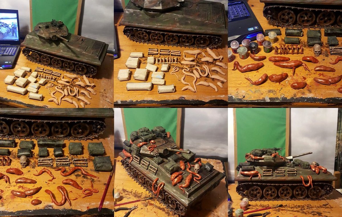 Особенно показателен пример с танком: на нем хорошо видно, сколько мелких деталей было изготовлено для доработки модели в стиле Death Stranding.