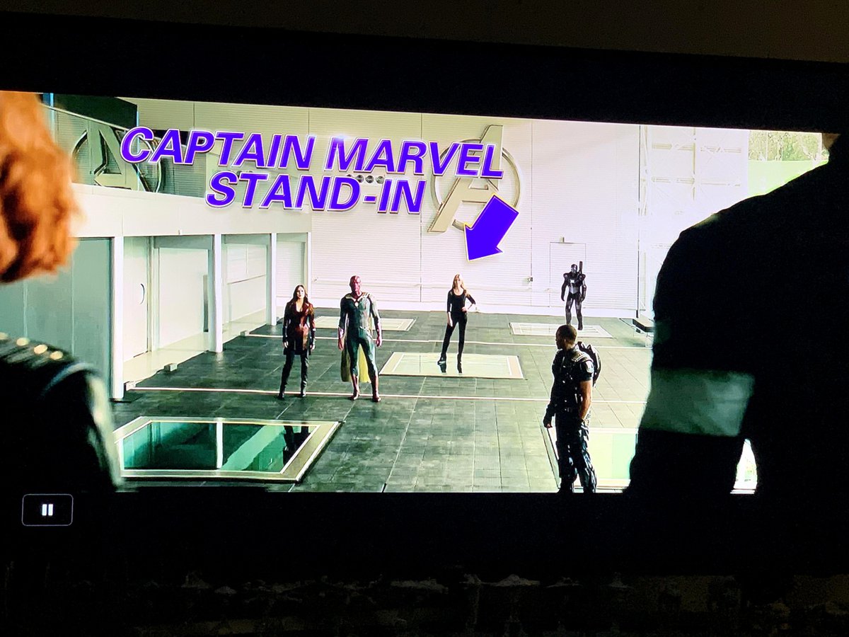 В итоге Капитана Марвел вырезали из фильма еще до того, как на ее роль подыскали актрису. Девушка, стоящая на снимке вместе с Элизабет Олсен, Полом Беттани и Энтони Маки, это дублер.