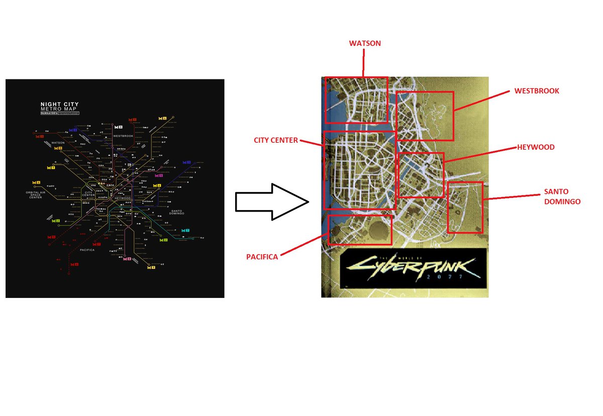 Фанаты уже сопоставили карту Найт-Сити с обложки и схему метро, появлявшуюся в трейлерах игры. Похоже, на обложке показана только часть карты — или, возможно, разработчики отрезали кусочек Найт-Сити с космическим центром.