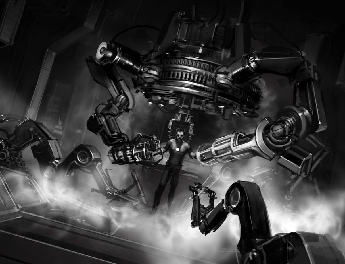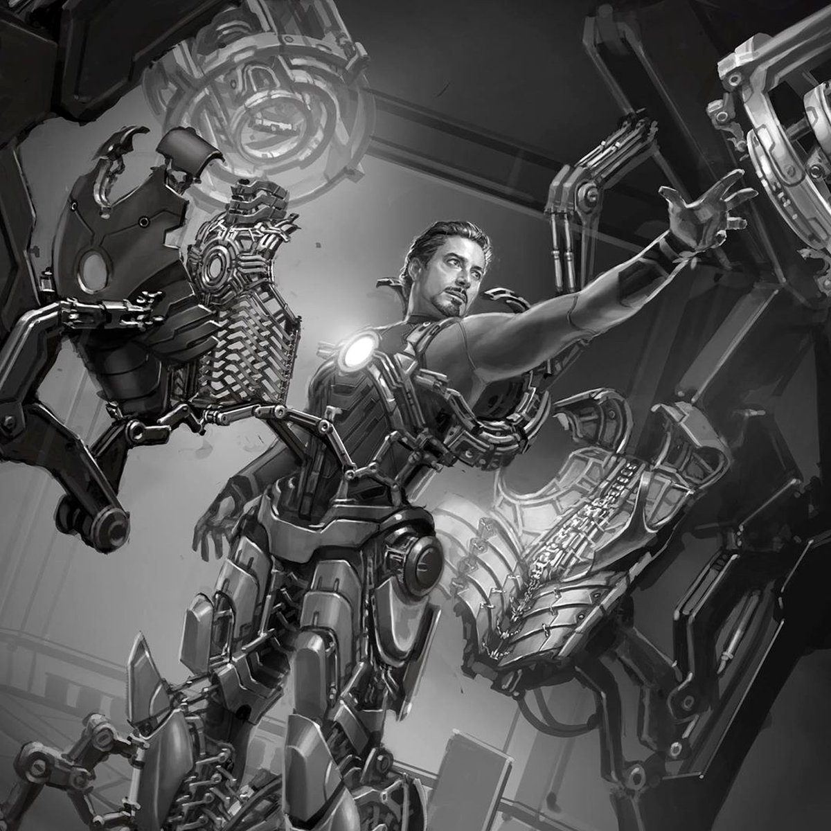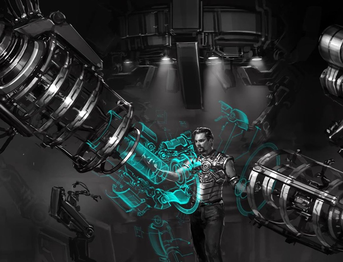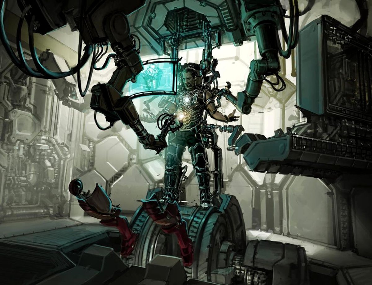 На некоторых артах эти устройства выглядят так, словно не просто надевают, а практически вживляют доспехи в тело Старка. Другие концепты ближе к той версии манипуляторов, что появилась в финальной версии «Железного человека».