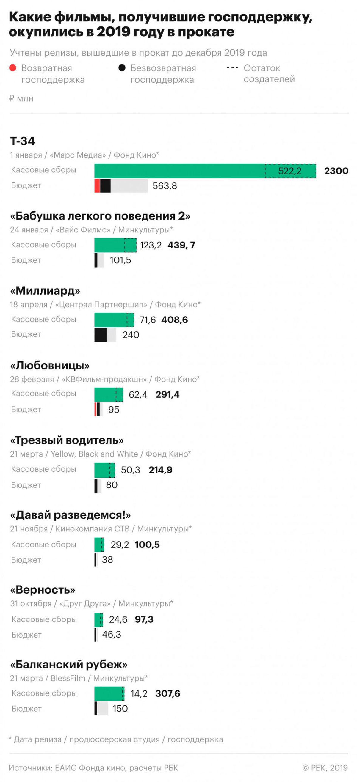 Журналисты РБК проанализировали кассовые успехи российских фильмов, выпущенных в прокат с января по ноябрь 2019 года и получавших государственное финансирование через Фонд кино. Всего за 11 месяцев в прокат вышло 68 таких фильмов.