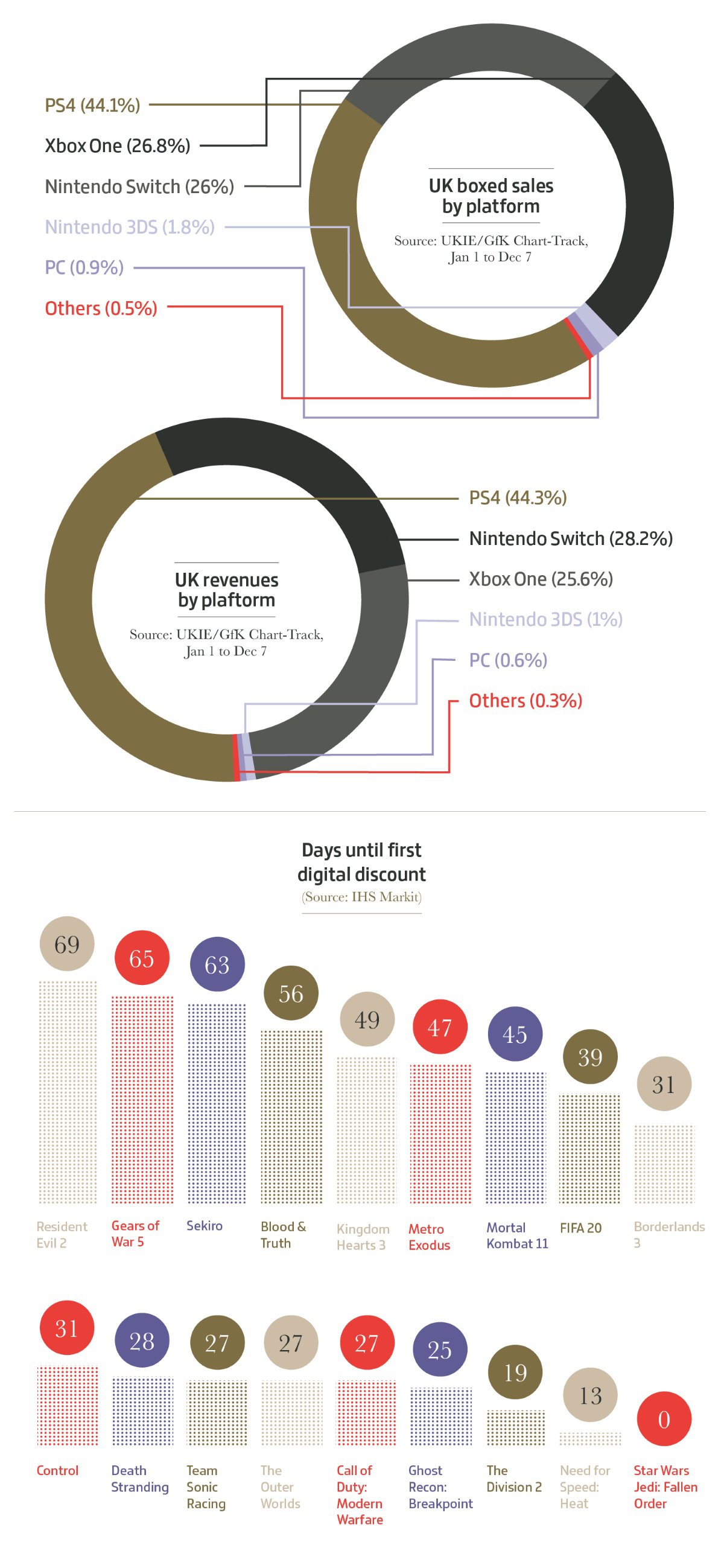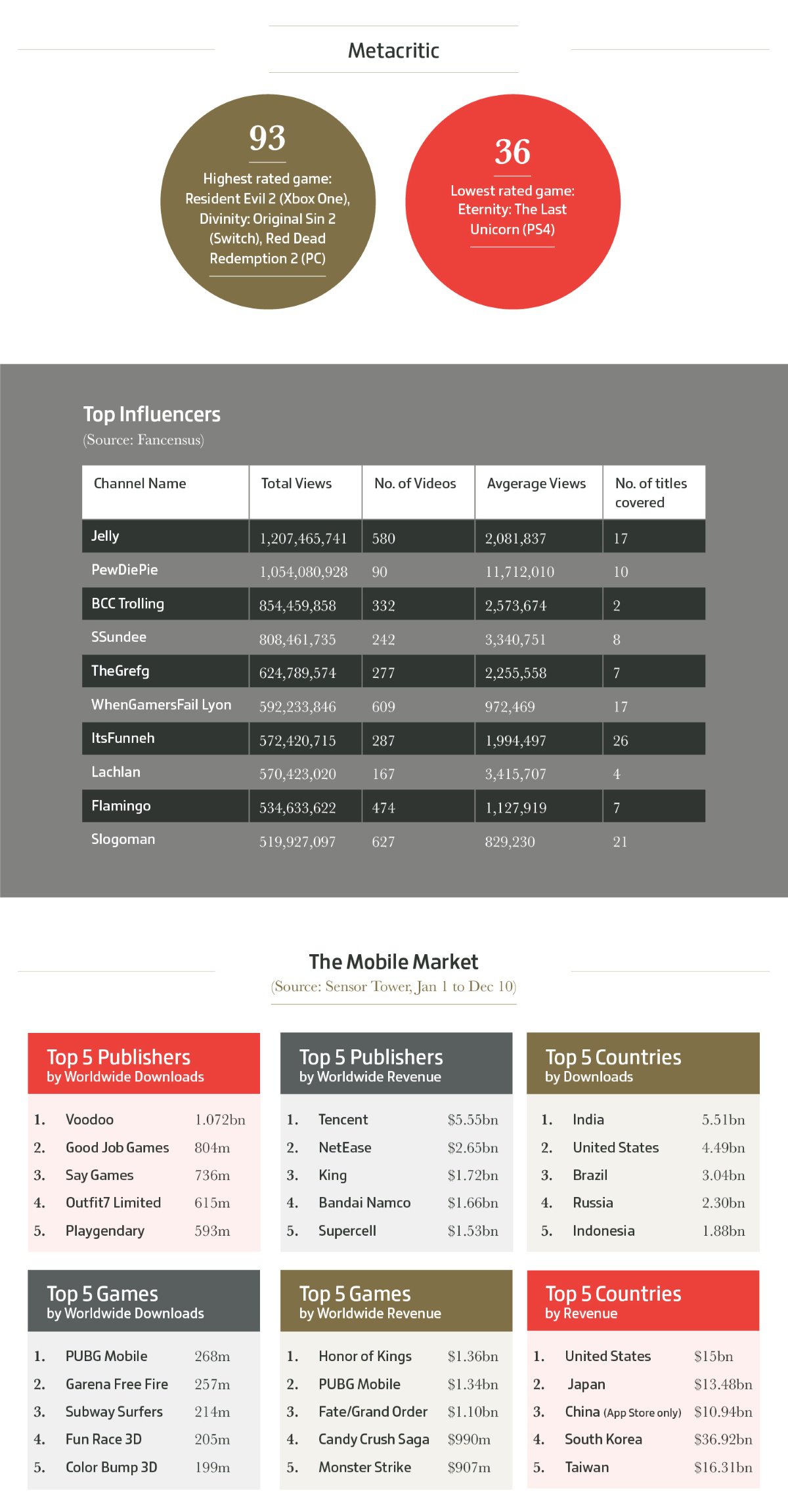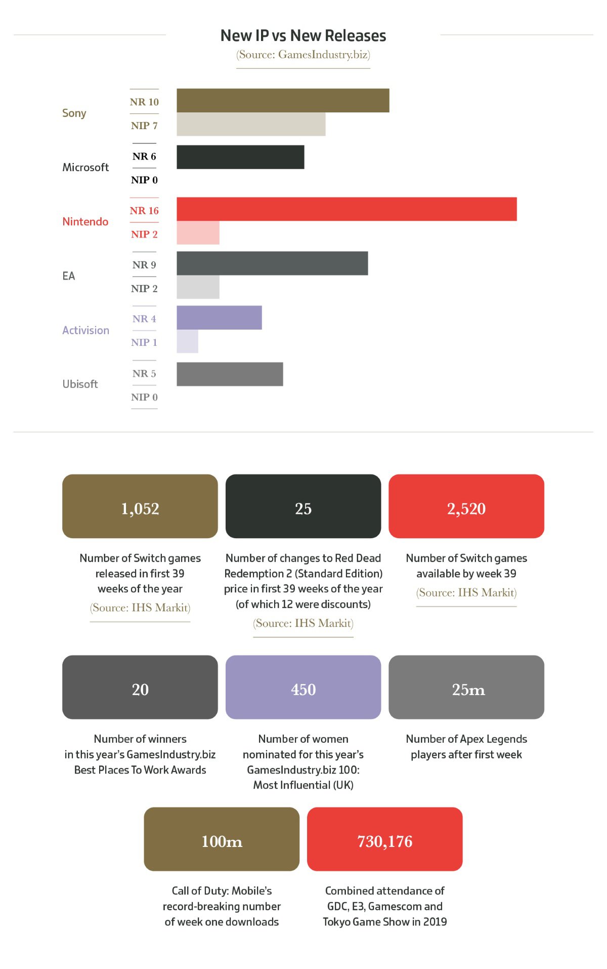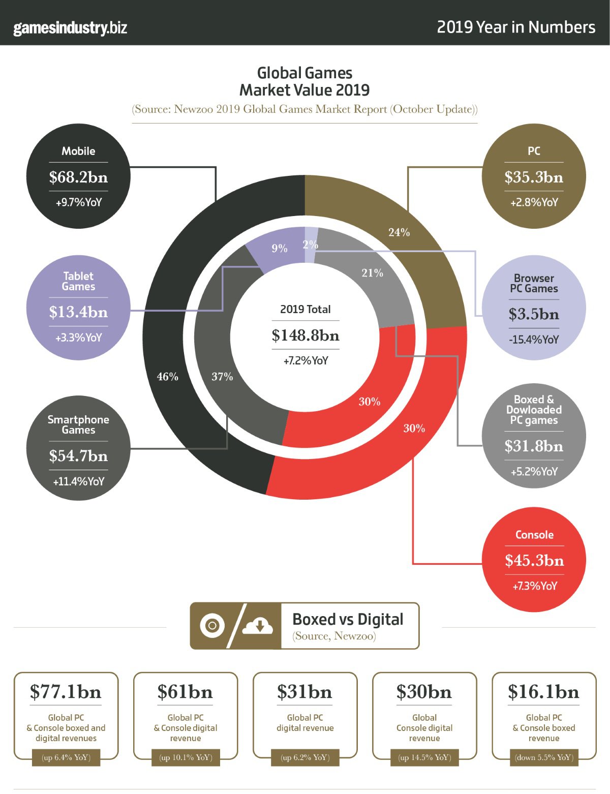 Издание GamesIndustry опубликовало ежегодную инфографику, посвященную положению игровой индустрии в 2019 году. При ее составлении использовались данные Newzoo, UKIE, GfK Chart-Track, Sensor Tower и других исследовательских или аналитических компаний.