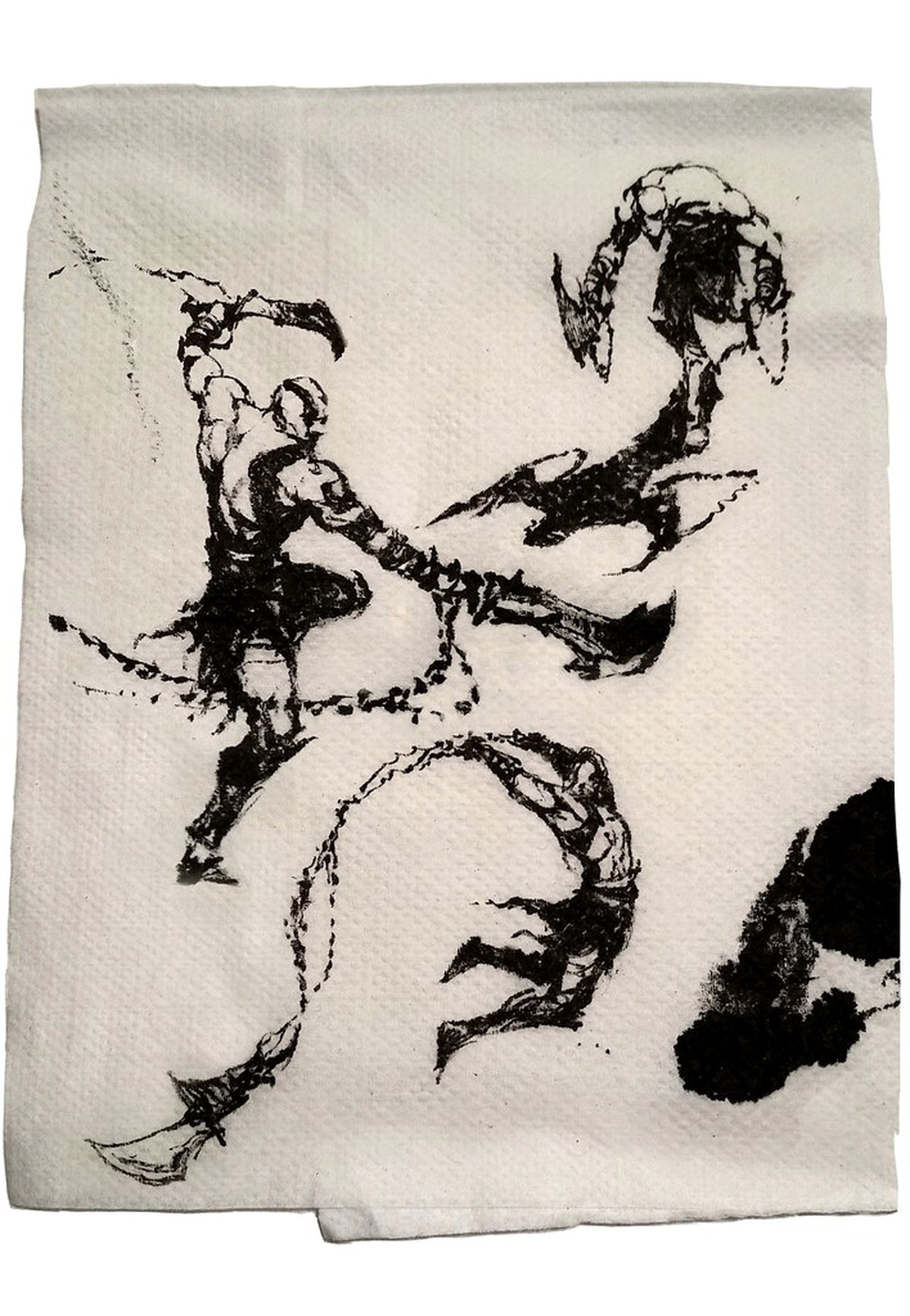 Во время обеда, вспоминает Вен, ему удалось создать практически финальную версию персонажа: тогда было придумано 90% дизайна Кратоса. Большая часть артов пропала — салфетки это не самый долговечный материал, — но один Вен сохранил.