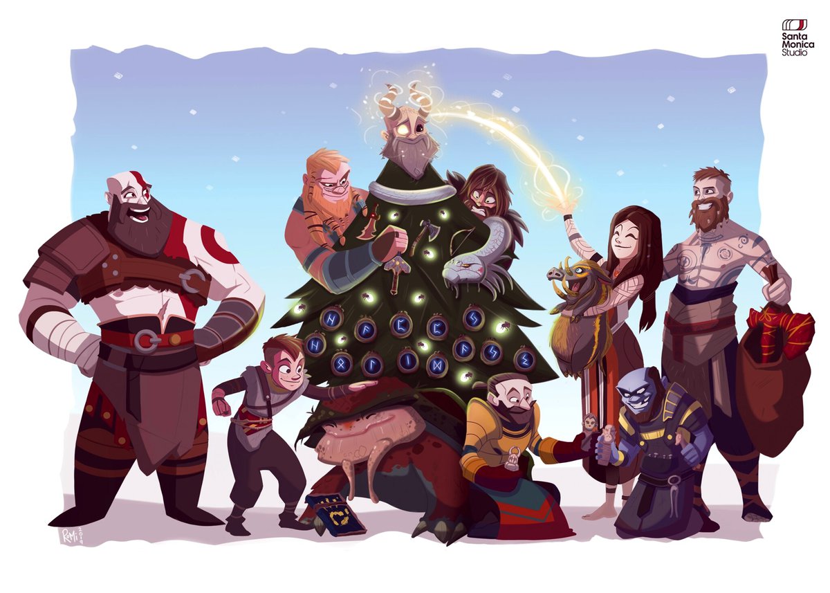 А еще — снежные равнины The Last of Us 2, Дикон Сент Джон, незаметно превратившийся в узор на свитере, и Кратос с Атреем и Фрейей, наряжающие новогоднюю елку. Мимиру повезло меньше всего: он стал главным елочным украшением.