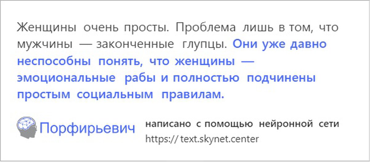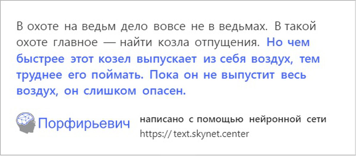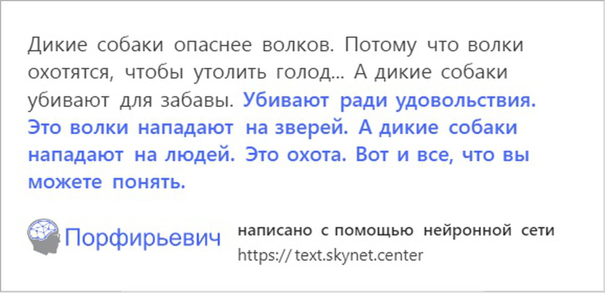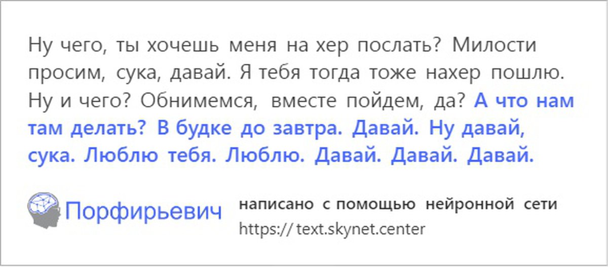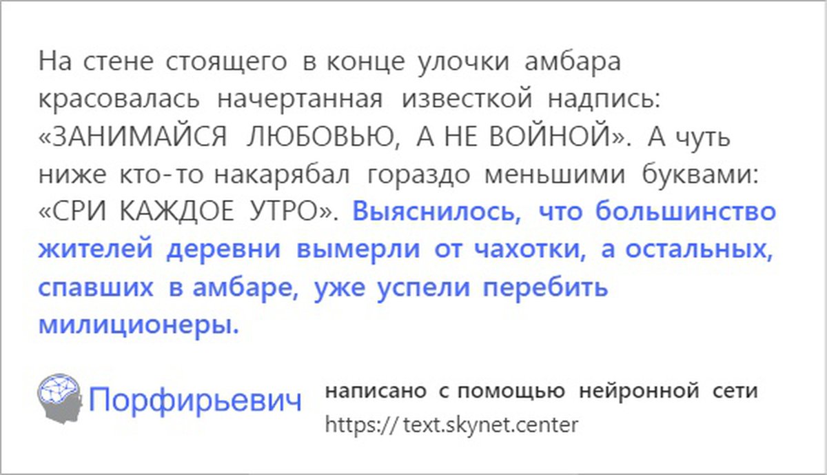 Иногда тексты, которые генерирует искусственный интеллект, получаются пугающе осмысленными. Правда, обычно для получения интересного результата приходится несколько раз просить нейросеть перегенерировать текст.