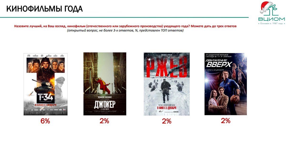 В списке лучших кинофильмов есть один иностранный проект, «Джокер» Тодда Филлипса: его признали лучшим 2% участников опроса. Лидером стал «Т-34», получивший 6% голосов.