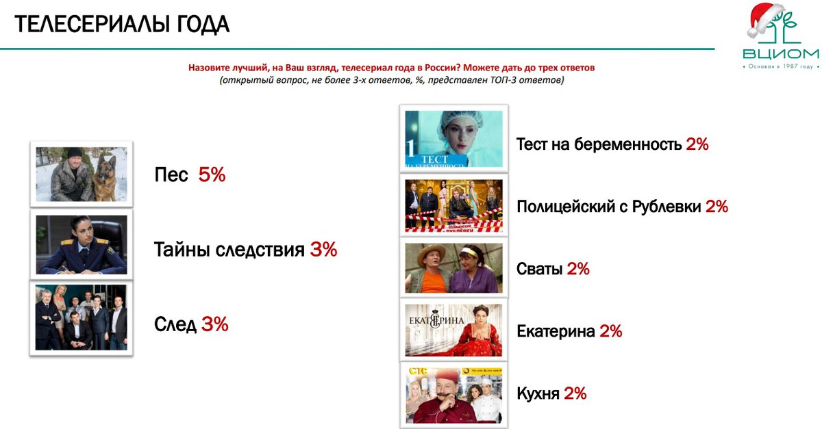 В том числе вопросы касались лучших сериалов и фильмов года. Среди сериалов участники опроса не назвали ни одного иностранного проекта; лидировали «Пес», «Тайны следствия», «След», «Тест на беременность» и «Полицейский с Рублевки».