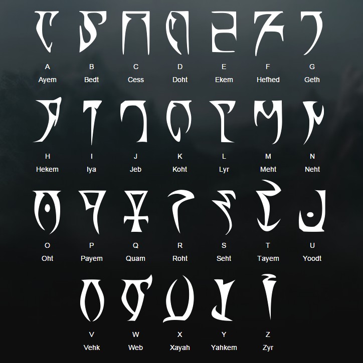 Сам язык не представляет собой ничего удивительного в плане этимологии, так как является просто заменой английских букв. Посему вы можете положить рядом с собой алфавит и без труда перевести текст даэдра на английский, а там уже и на русский. Есть, конечно, и русский неофициальный алфавит на даэдрическом, однако с помощью него вы ничего не сможете перевести.