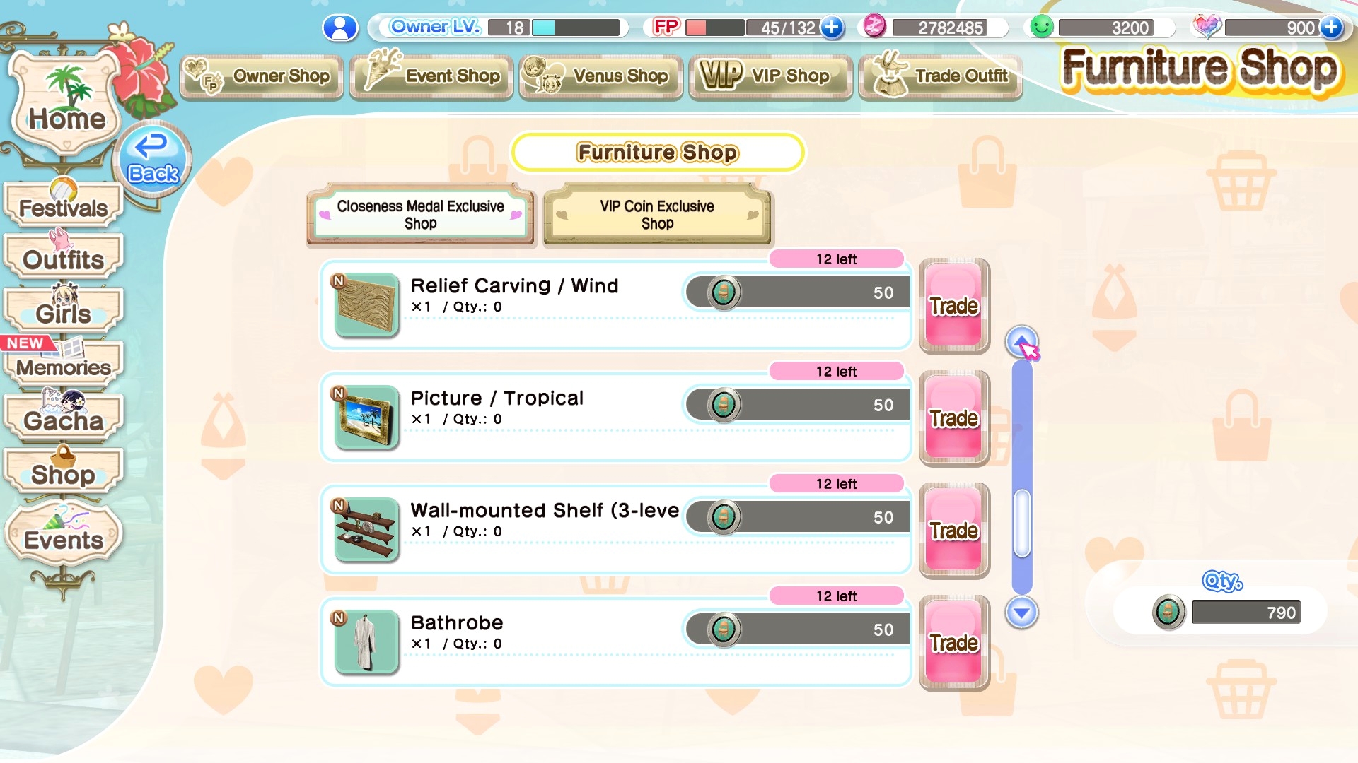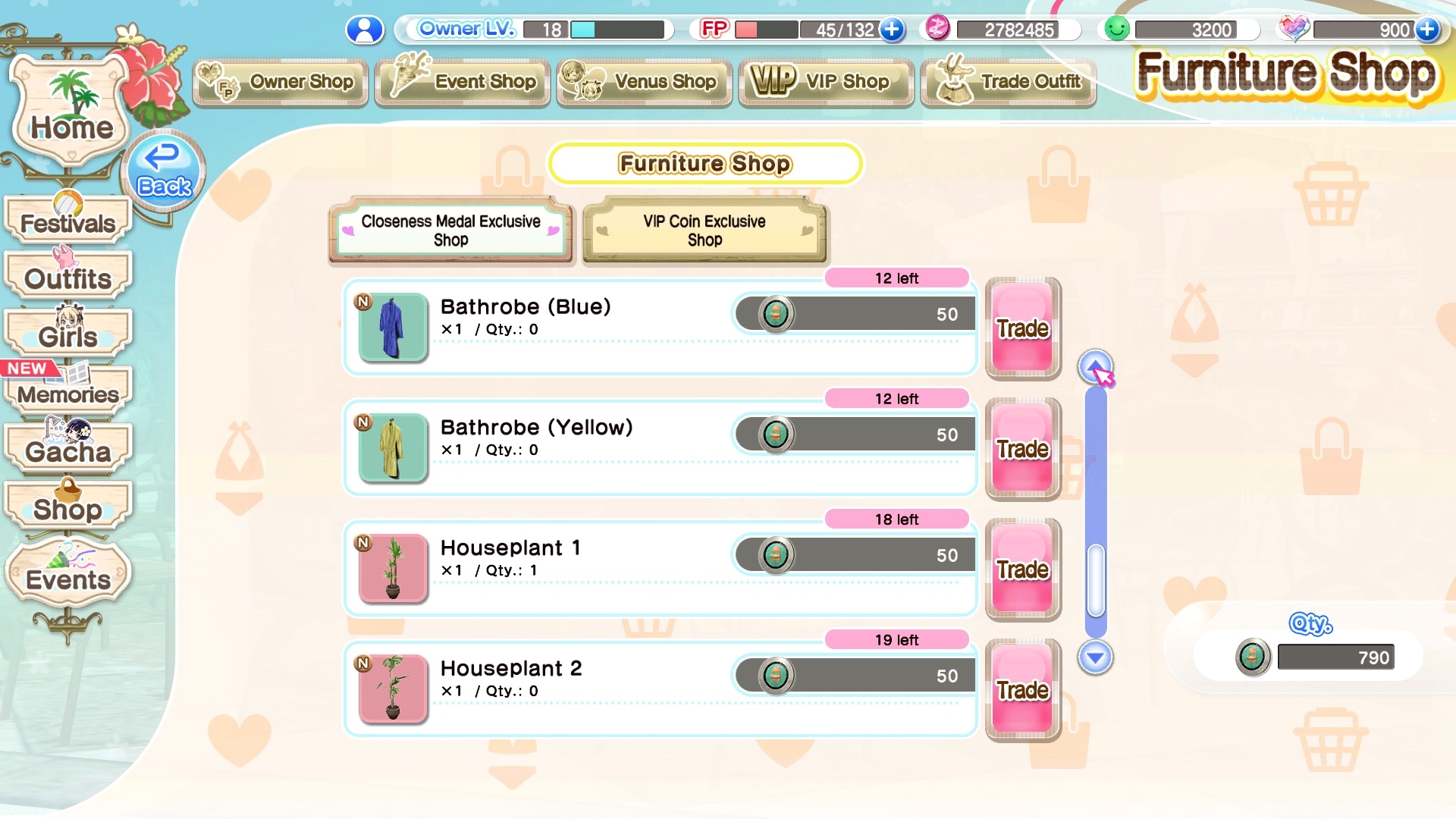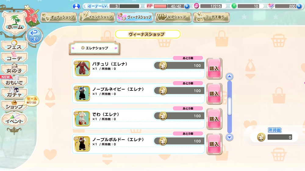Магазин. Вот когда я зашел в магазин в японской версии, после того, как прокачал Хелену до 37 уровня в англоязычной, мне стало жутко обидно. Обидно за то, сколько всего я просто упустил... Я стремительно пытался заработать на кровать, чтобы делать снимки (а ведь некоторые товарищи с оффтопа эти снимки видели). Но весь энтузиазм рухнул, когда я увидел, что творится в японской версии... Весь ассортимент шире, раза так в три! Да даже больше, ибо только недавно был ивент нового года, и чтобы его выполнить – нужно было купить костюм... Как минимум одного костюма не было, но увы, его могу показать только в миниатюре, просто потому, что ивент пропустил...