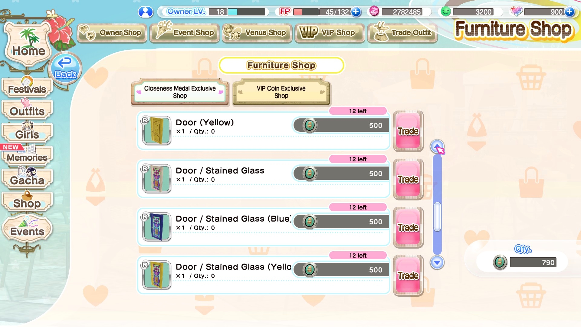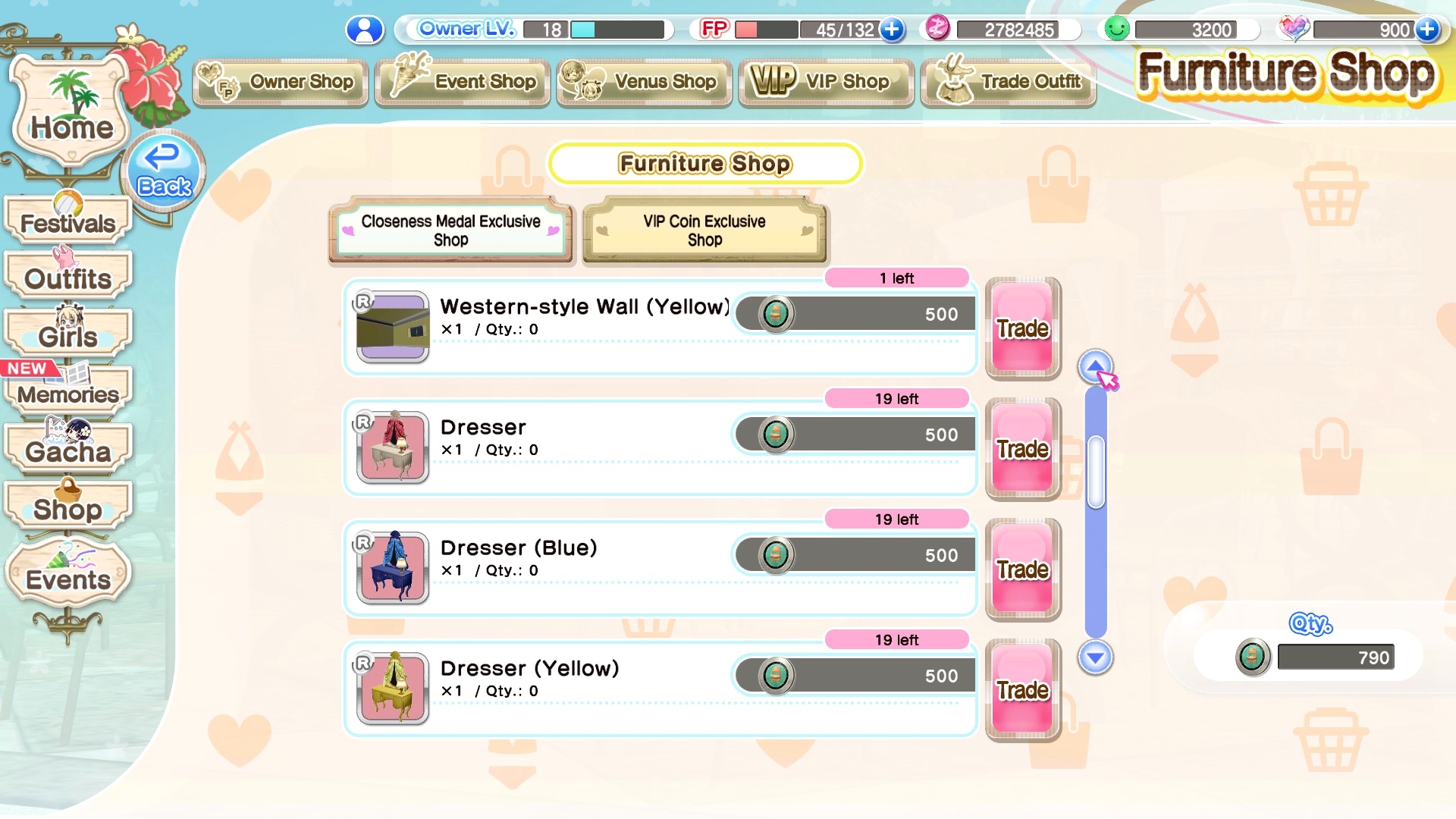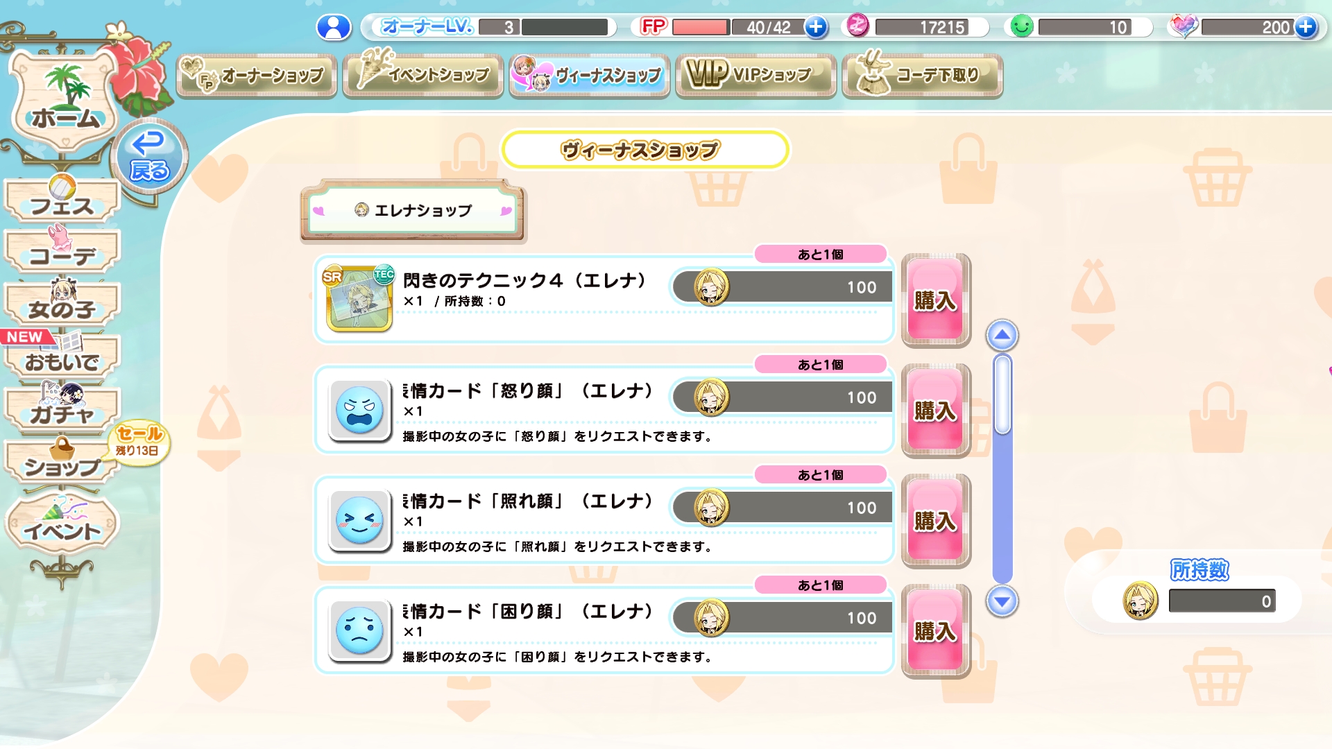 Магазин. Вот когда я зашел в магазин в японской версии, после того, как прокачал Хелену до 37 уровня в англоязычной, мне стало жутко обидно. Обидно за то, сколько всего я просто упустил... Я стремительно пытался заработать на кровать, чтобы делать снимки (а ведь некоторые товарищи с оффтопа эти снимки видели). Но весь энтузиазм рухнул, когда я увидел, что творится в японской версии... Весь ассортимент шире, раза так в три! Да даже больше, ибо только недавно был ивент нового года, и чтобы его выполнить – нужно было купить костюм... Как минимум одного костюма не было, но увы, его могу показать только в миниатюре, просто потому, что ивент пропустил...
