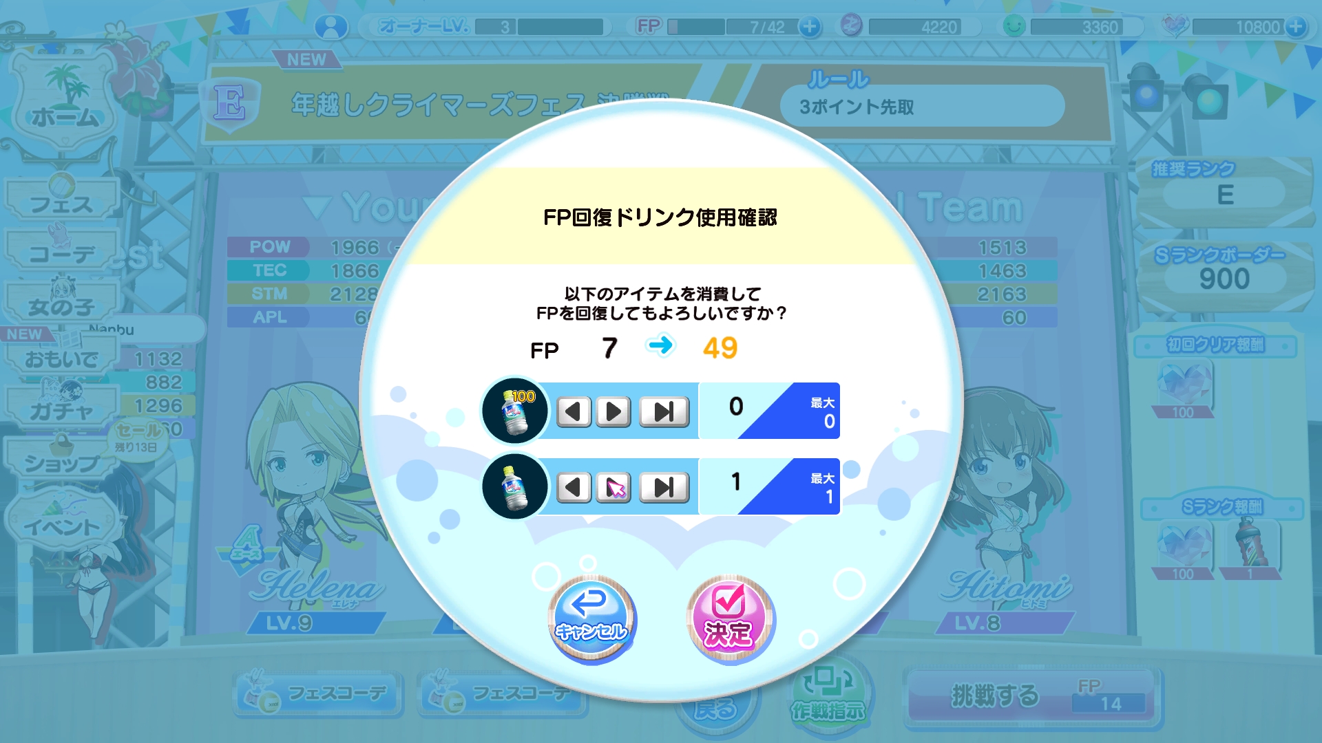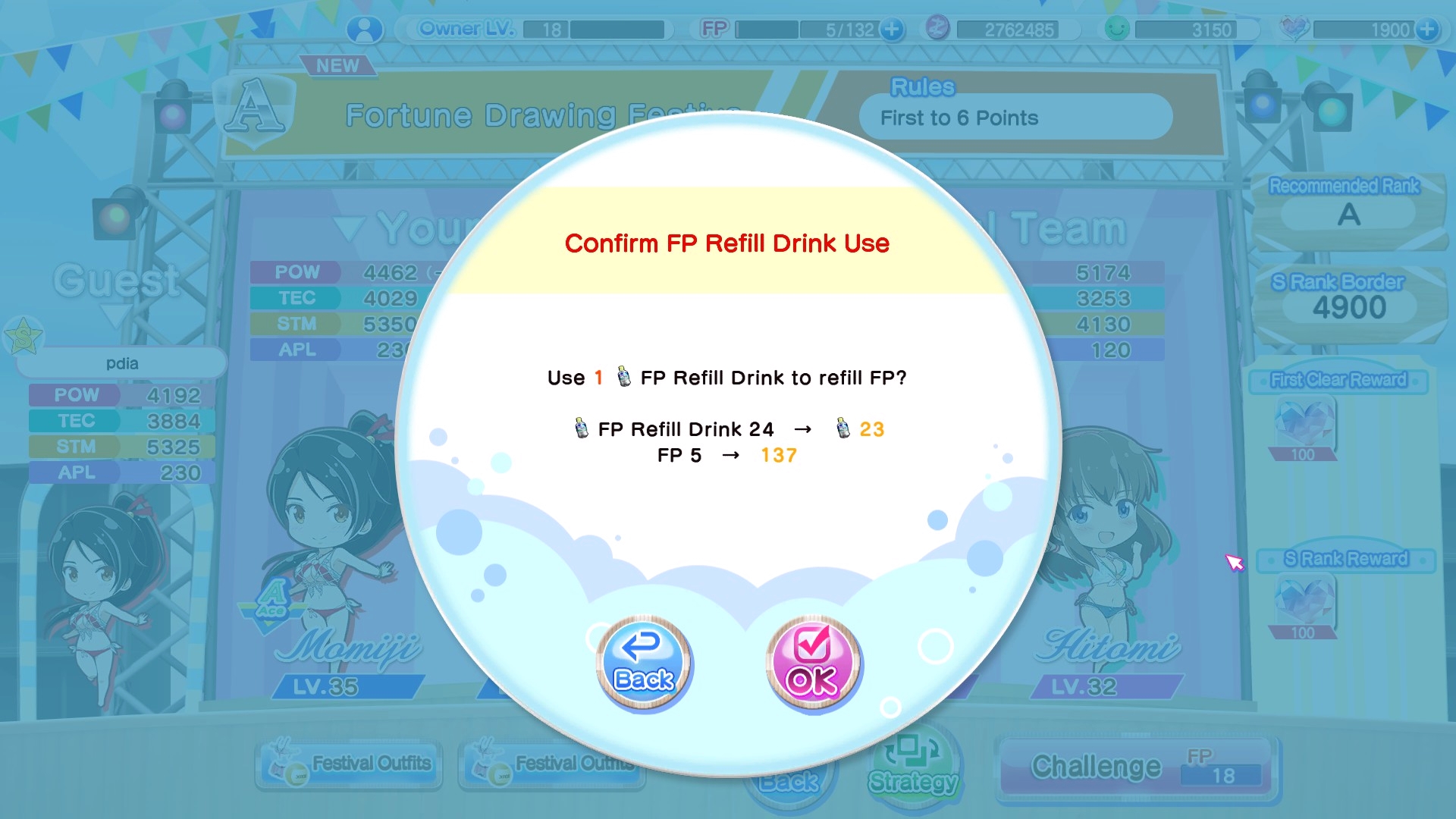 Поиграв подольше, измотав девчонок, вам предложат две вещи: восполнить FP выпив водички, посмотреть ролики с героинями, или же подождать, пока не восполниться шкала силы. Ничего необычного, но тут японцы отличились и в их версии существует как маленькая бутылочка воды, восполняющая половину FP, так и большая, на 100 единиц. Когда в своё время, английская версия, имеет только один тип и восполняет сразу 100 единиц.