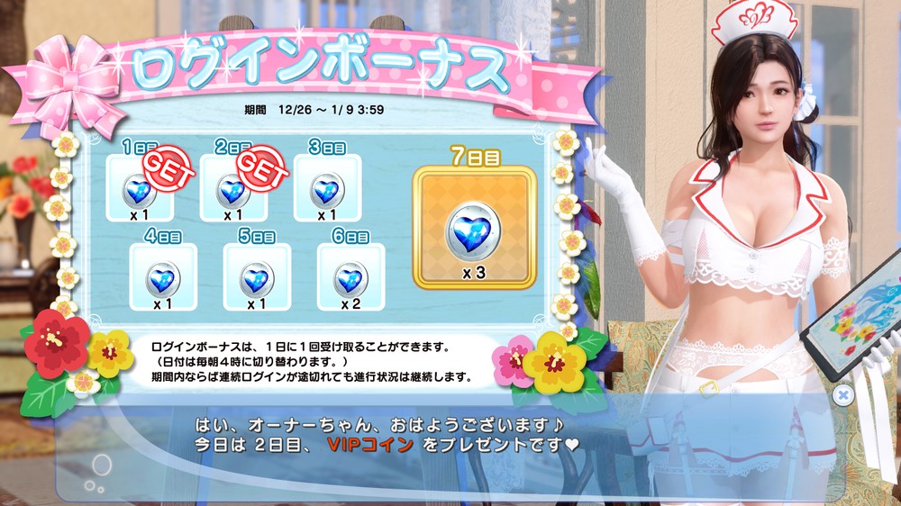 А также дневной подарок, который тут, во время ивента, выдают две девушки, а не одна. Обычно, в Steam версии, Мисаки выдаёт два подарка, один за вход в игру, второй от ивента. В японской версии, во время ивента, на помощь Мисаки приходит другая девушка.