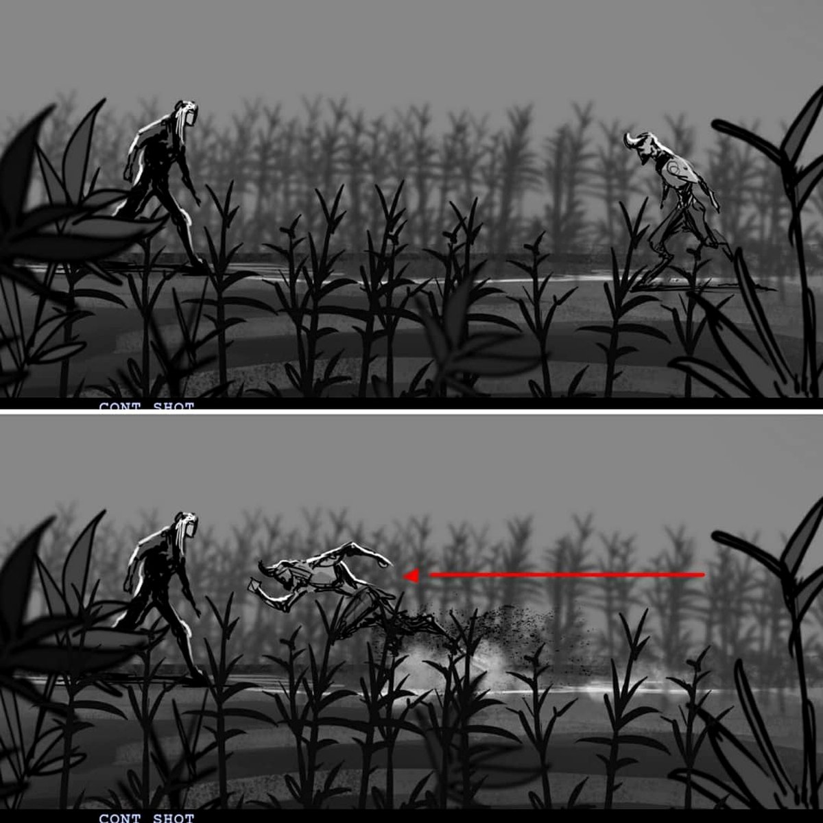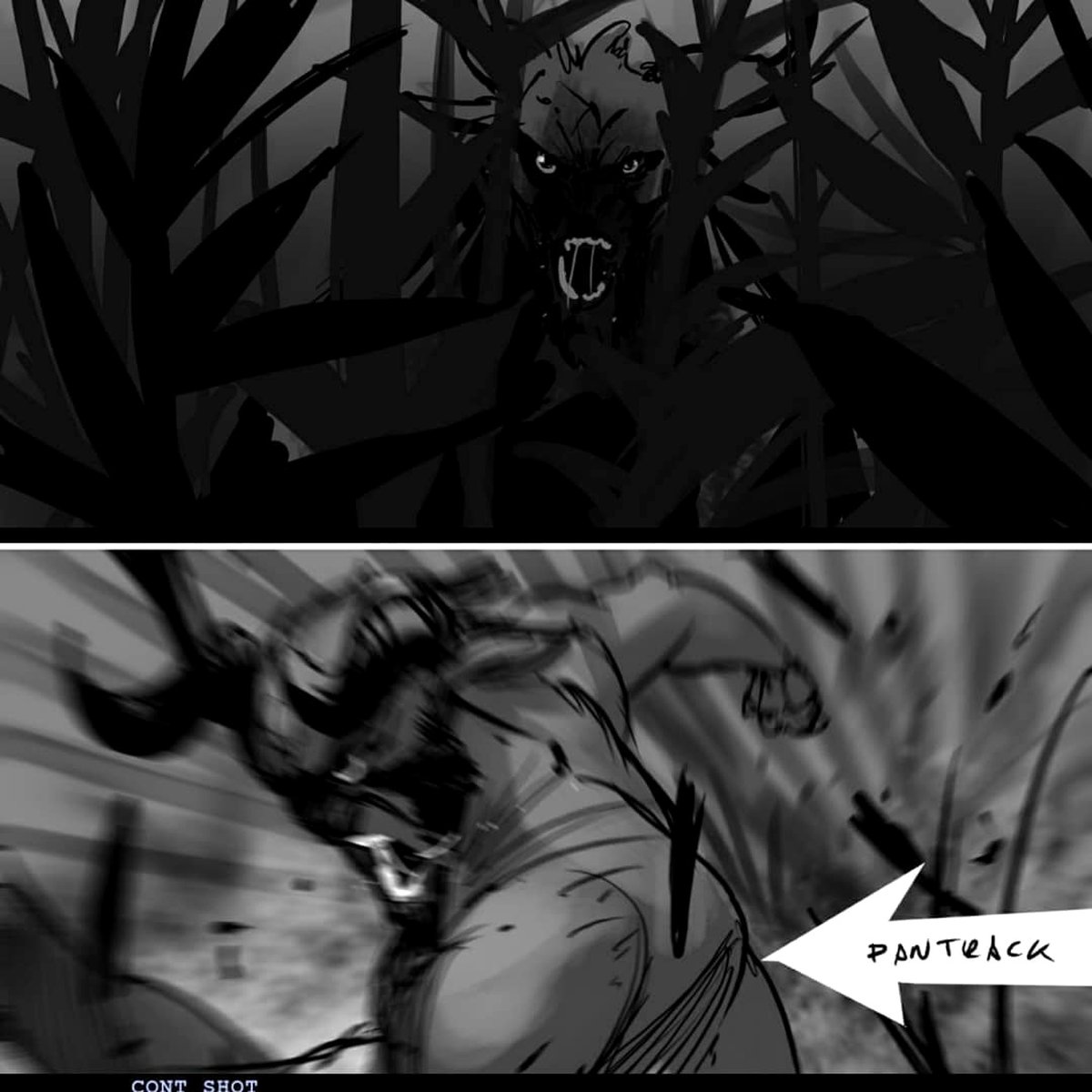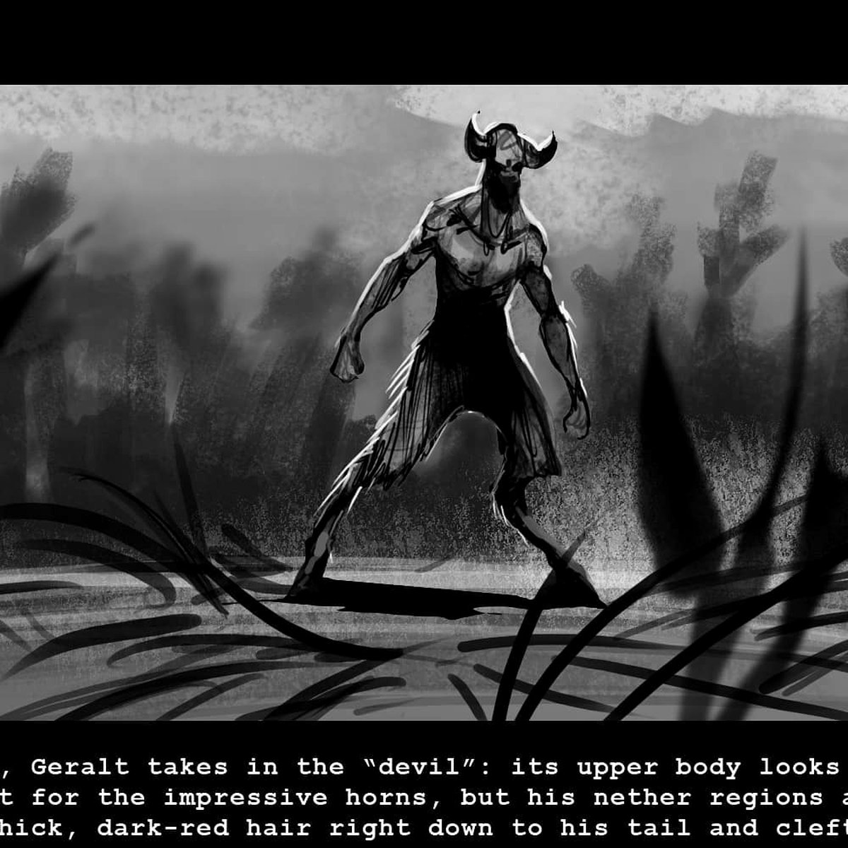 Мы уже показывали раскадровки «Ведьмака», посвященные сценам битвы со стрыгой — они выглядят почти так же, как в самом сериале. Первая встреча Геральта и Лютика с сильваном Торкве это совершенно другая история.