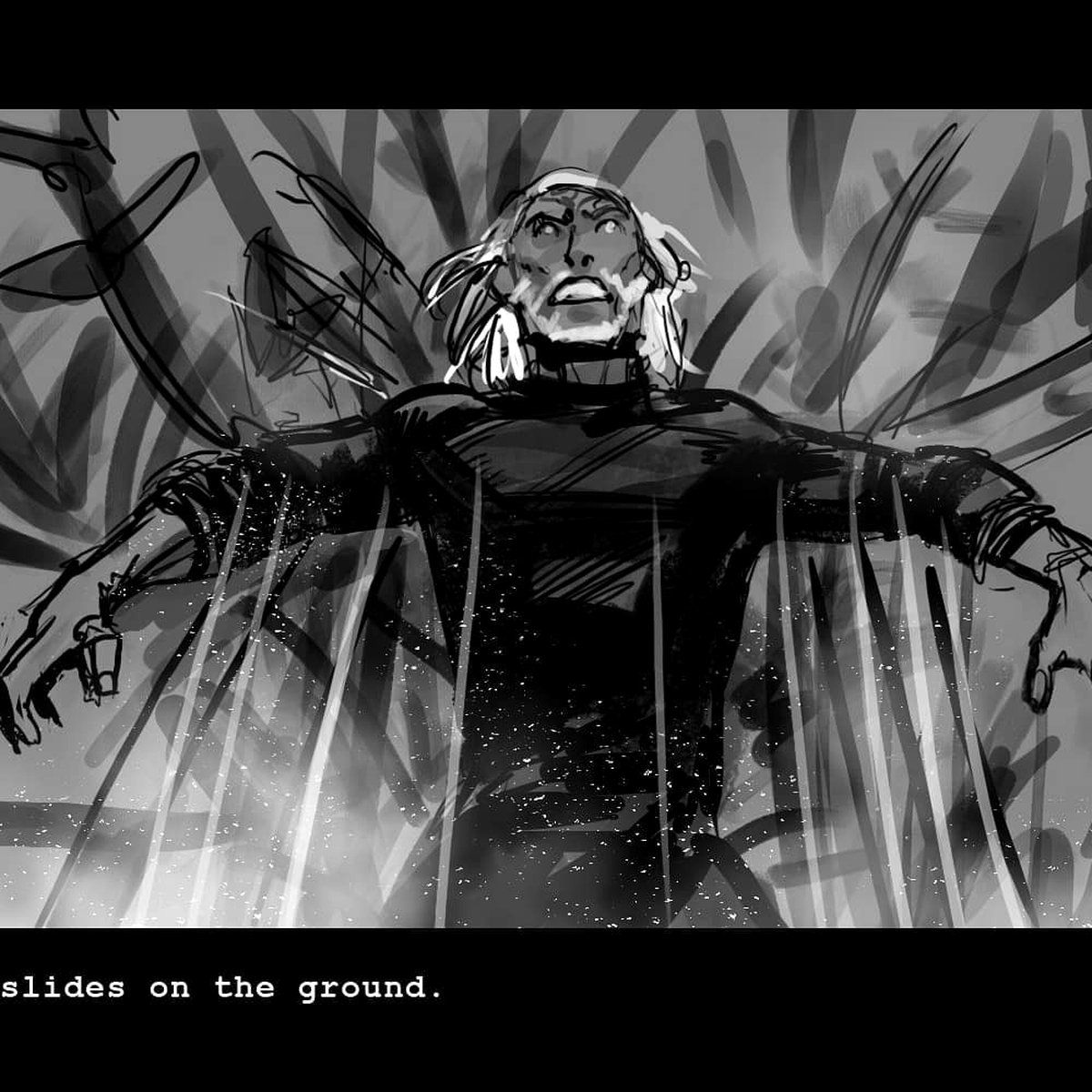Ведьмак с раскадровок бородат и усат, носит характерную прическу с хвостом на макушке и не отличается мощным телосложением. А еще он ловок: если в финальной версии сериала одни из шариков сильвана все же задел Геральта, то на раскадровках ведьмак уворачивается от всех снарядов. Судьба Лютика, впрочем, не меняется.