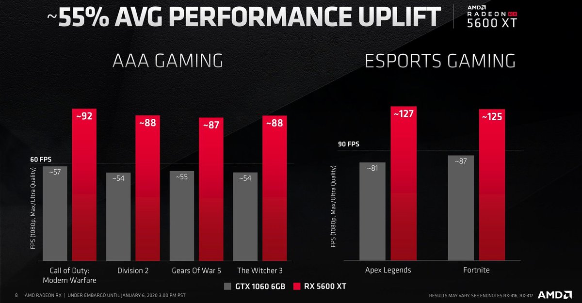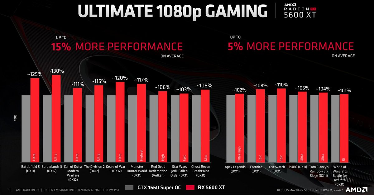 Согласно тестам самой AMD, новая видеокарта будет примерно на 10-20% быстрее GeForce GTX 1660 Ti и где-то на 5-15% быстрее GeForce GTX 1660 Super.