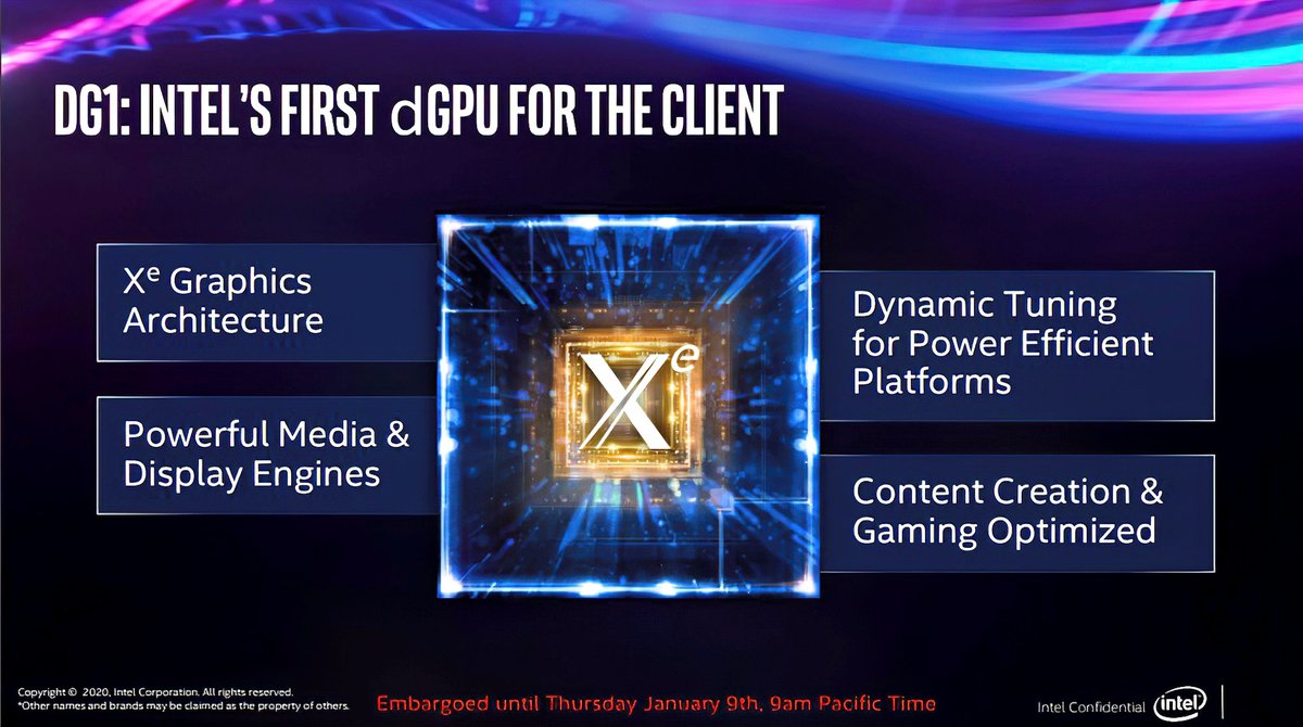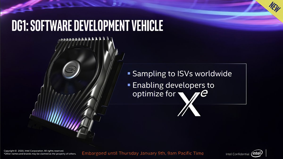 Корпорация Intel распространила презентацию, посвященную собственной линейке видеокарт, построенных на базе архитектуры Intel Xe. В презентации показан внешний вид Intel Xe DG1, прототипа видеокарты, использующегося разработчиками.