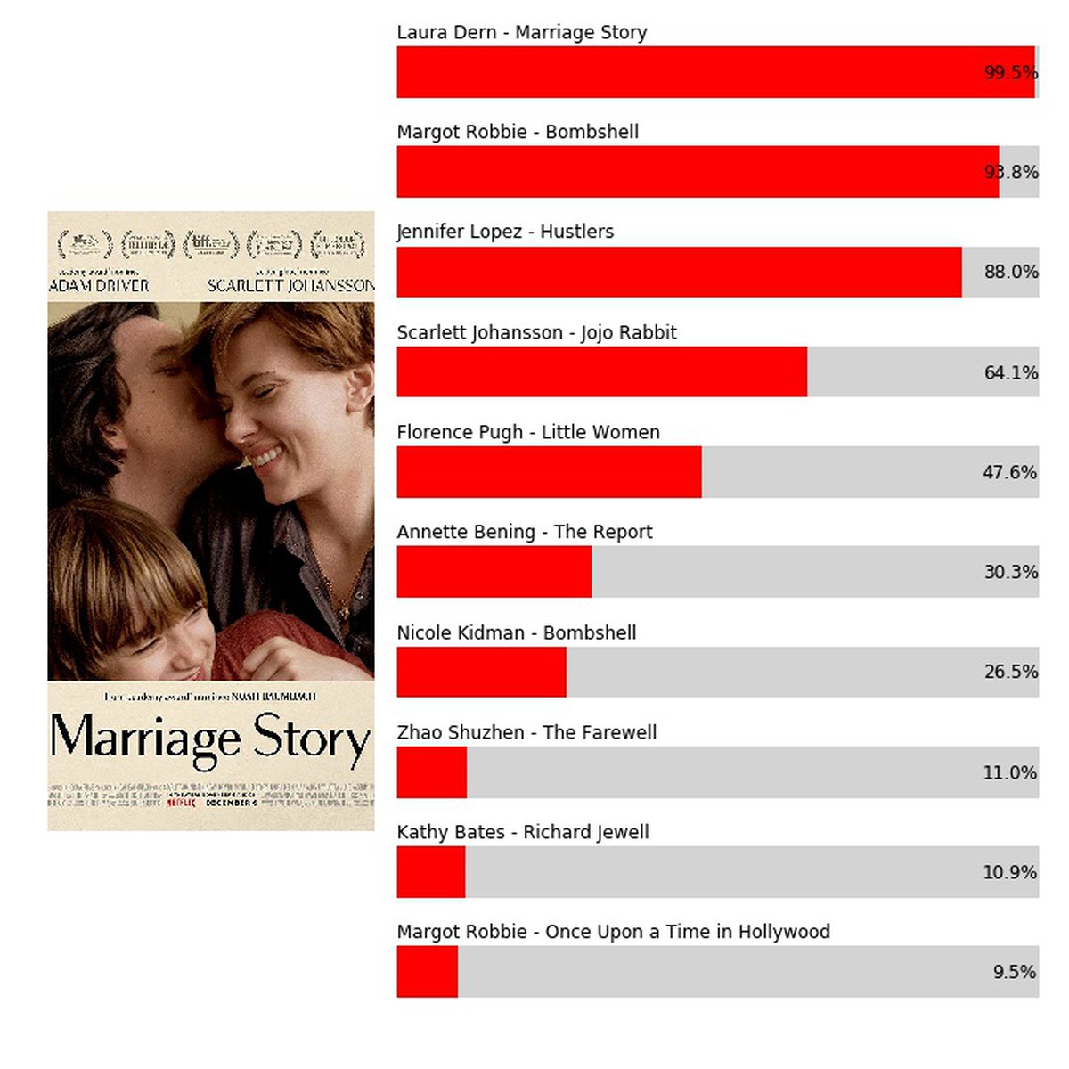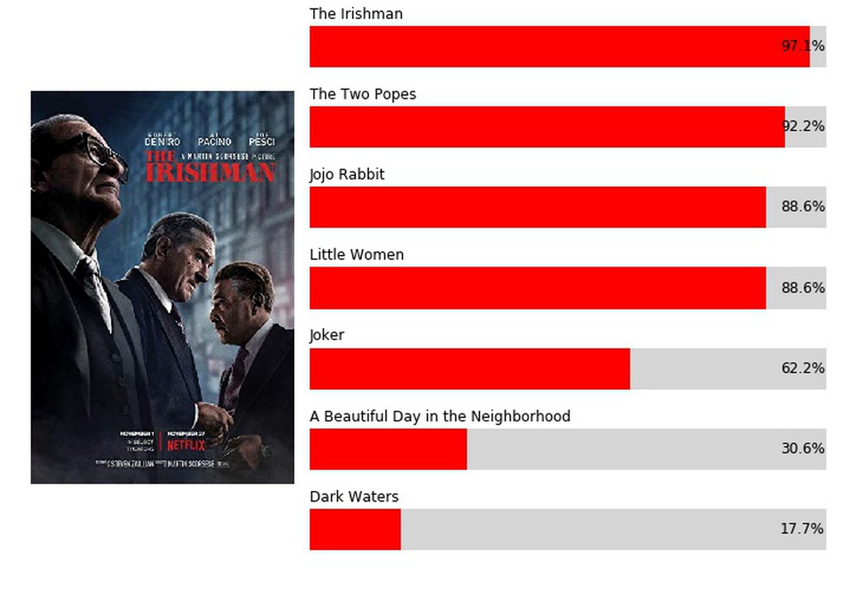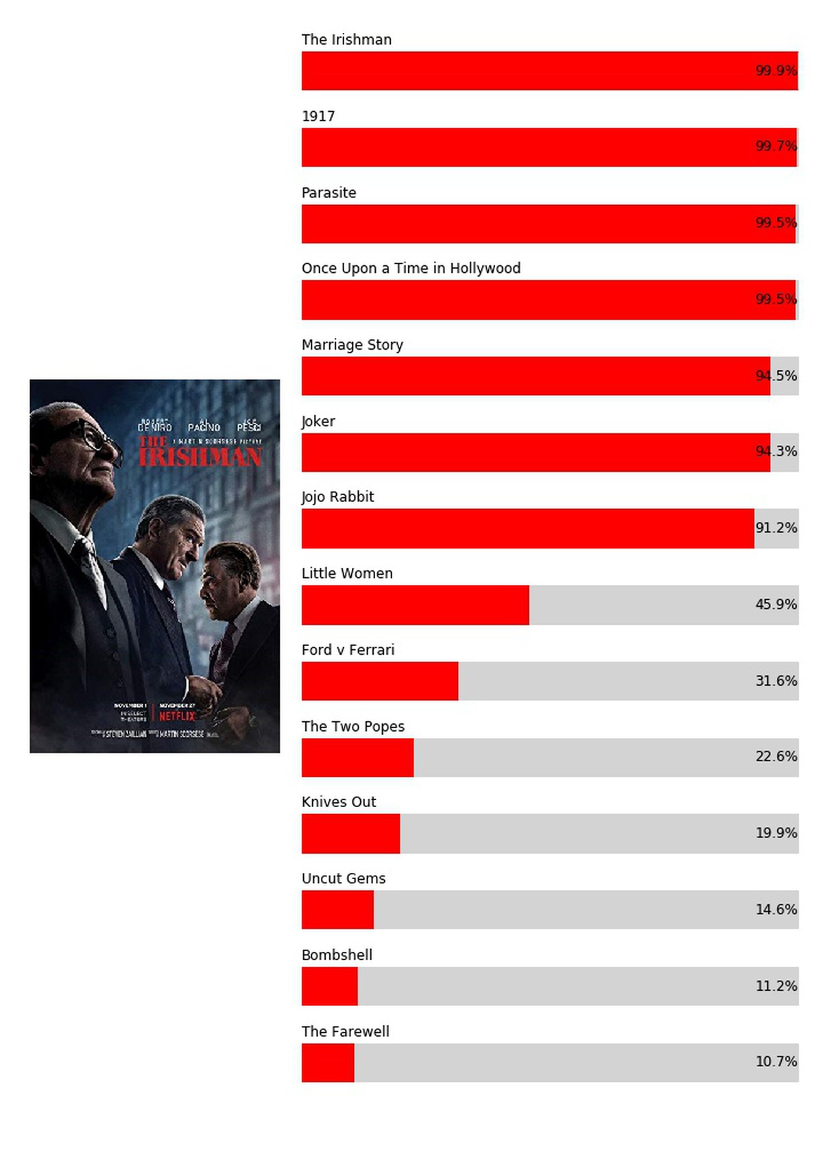 Похожая ситуация произошла с «Ирландцем». Сам фильм и режиссер Мартин Скорсезе почти наверняка будут выдвинуты в категориях «Лучший фильм» и «Лучший режиссер», но шанс номинации для Роберта де Ниро модель оценивает в 19.1%.