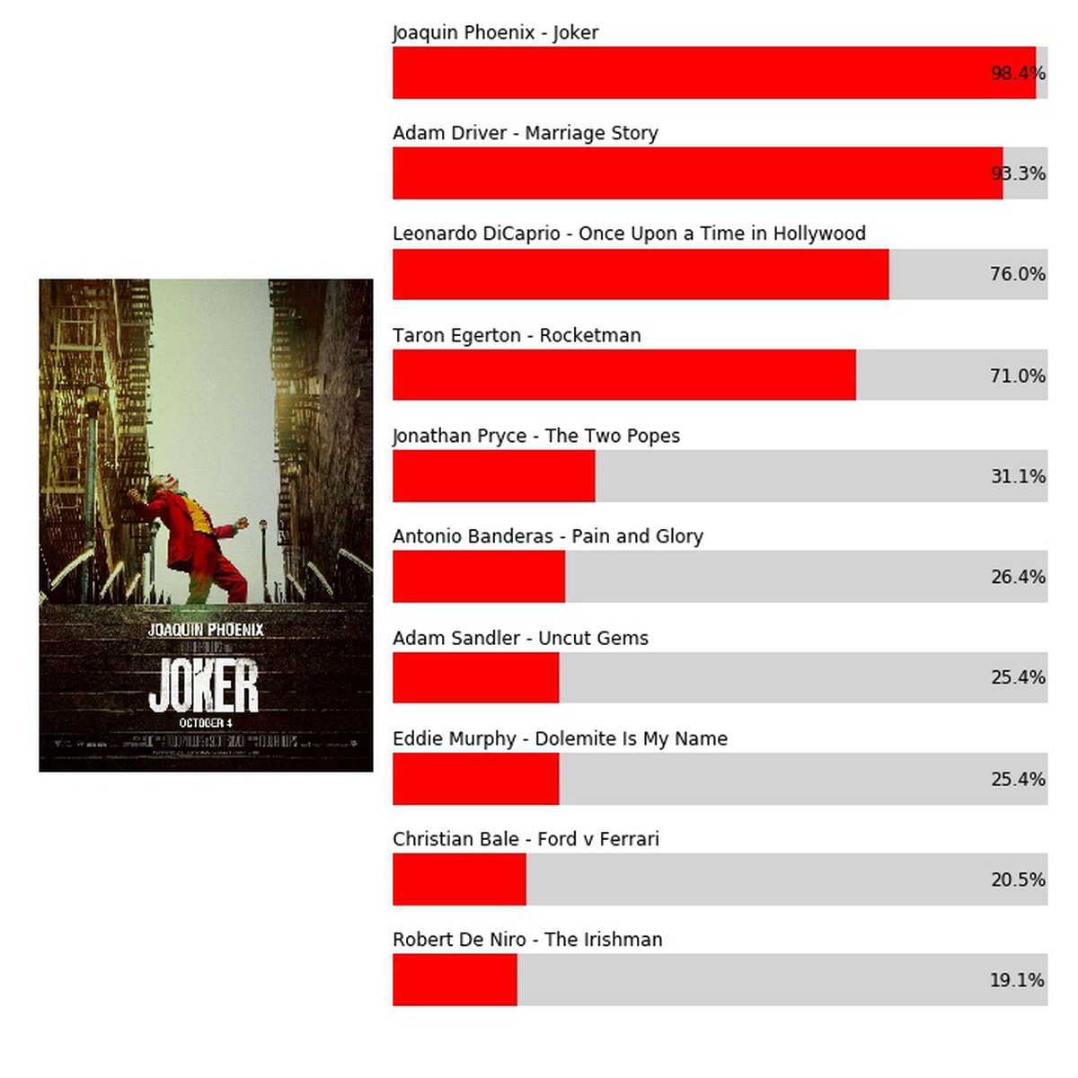 В прогнозе Бена есть несколько любопытных моментов. Во-первых, модель оценивает вероятность выдвижения «Джокера» в категории «Лучший фильм» чрезвычайно высоко, но режиссер Тодд Филлипс вряд ли будет номинирован на премию за лучшую режиссуру.
