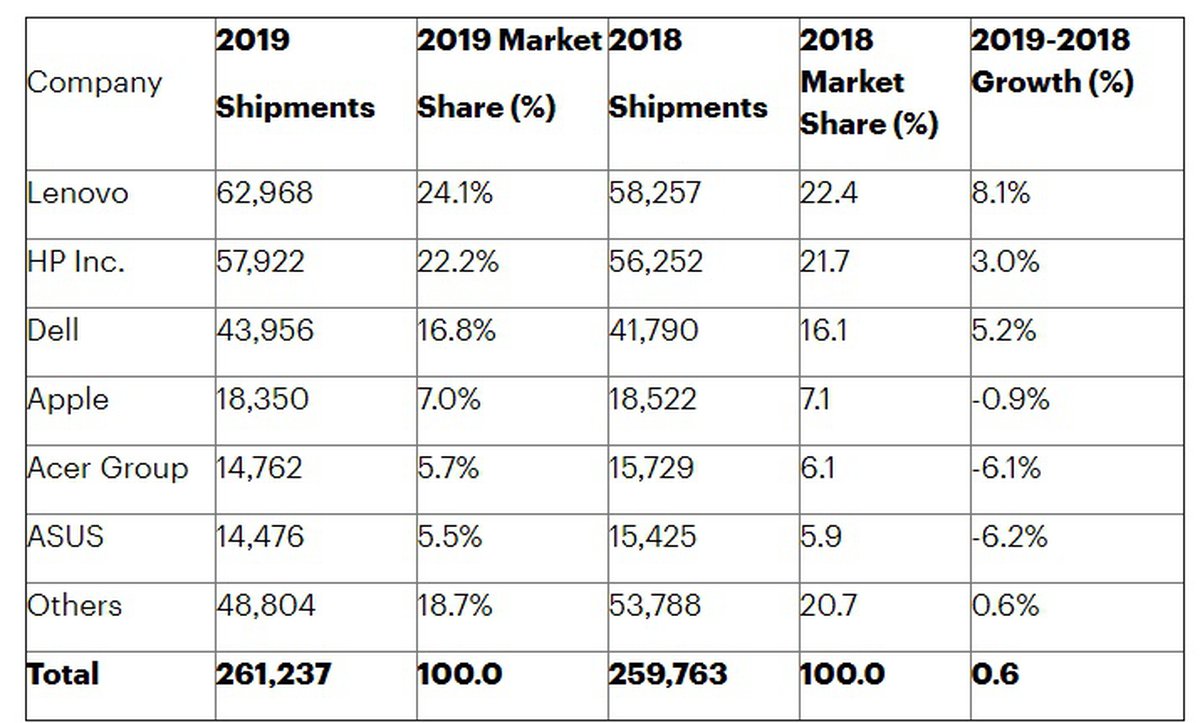 Лидером по продажам в 2019 году стали PC компании Lenovo — на них приходится 24.1% рынка. В тройку лидеров входят HP и Dell, доля ASUS оказалась ниже, чем у корпорации Apple.