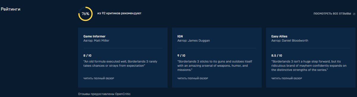 На странице игры выводятся по три обзора, увидеть остальные можно на OpenCritic. Читать обзоры напрямую из магазина нельзя, выводится только оценка и короткая подводка рецензии. Средний балл обзоров в Epic Games Store не показывается.