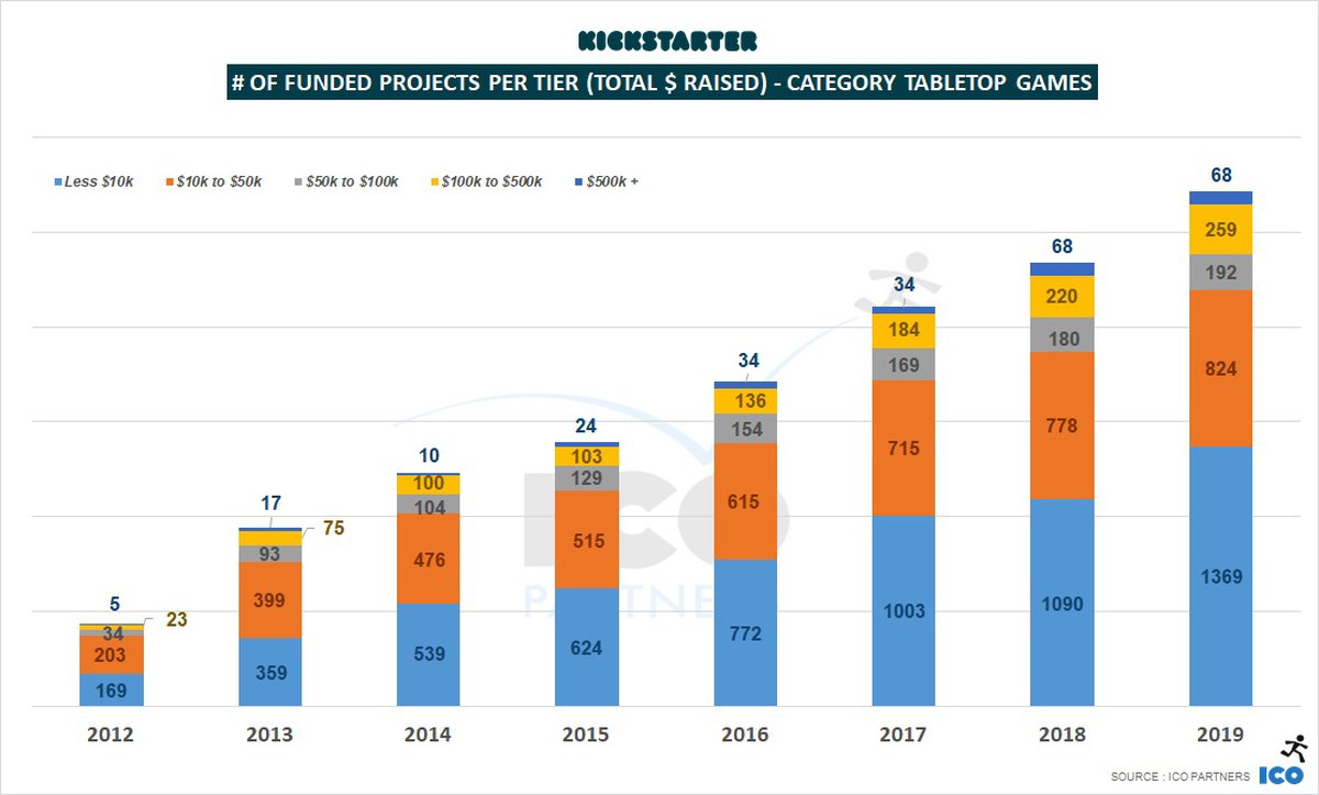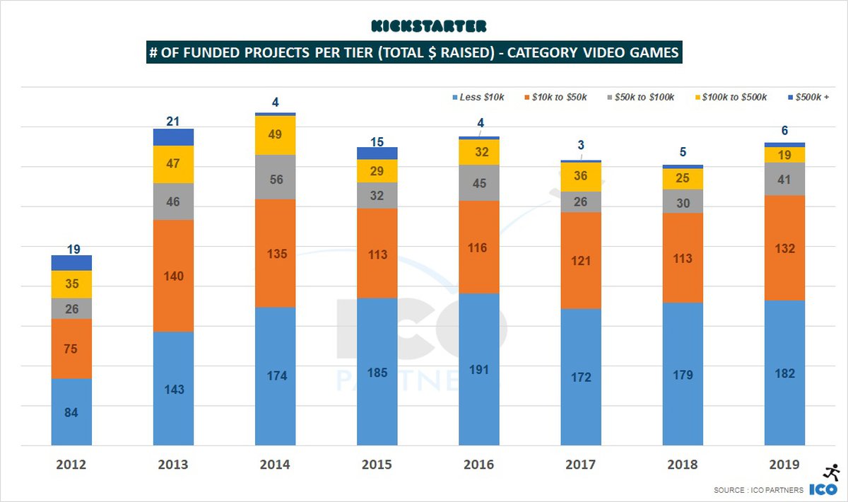 В 2019 году только шесть видеоигровых кампаний сумели собрать на Kickstarter больше $500 тысяч, бюджеты еще 19 проектов составили от $100 тысяч до $500 тысяч. Годом ранее распределение было почти идентичным.