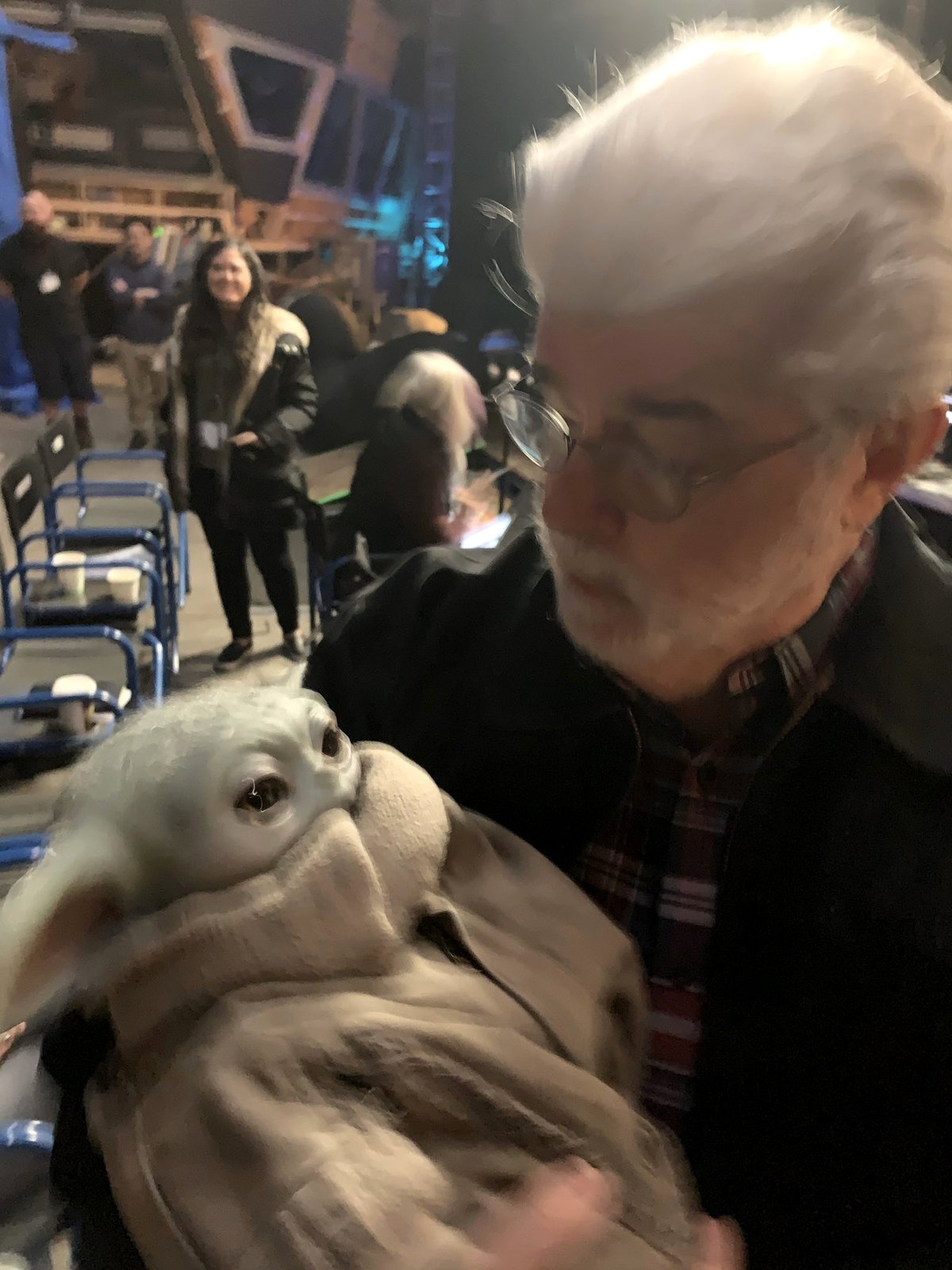 На кадре Фавро Джордж Лукас держит на руках «маленького Йоду», одного из ключевых персонажей «Мандалорца». Это чрезвычайно дорогая кукла-аниматроник: похожие куклы, но менее совершенные, использовались и во время съемок фильмов Лукаса.