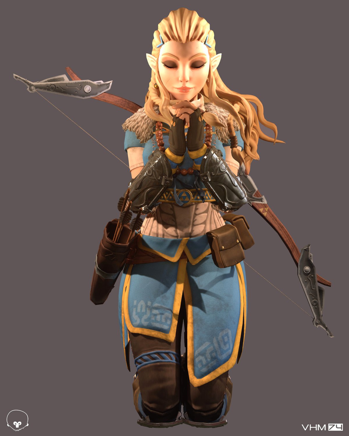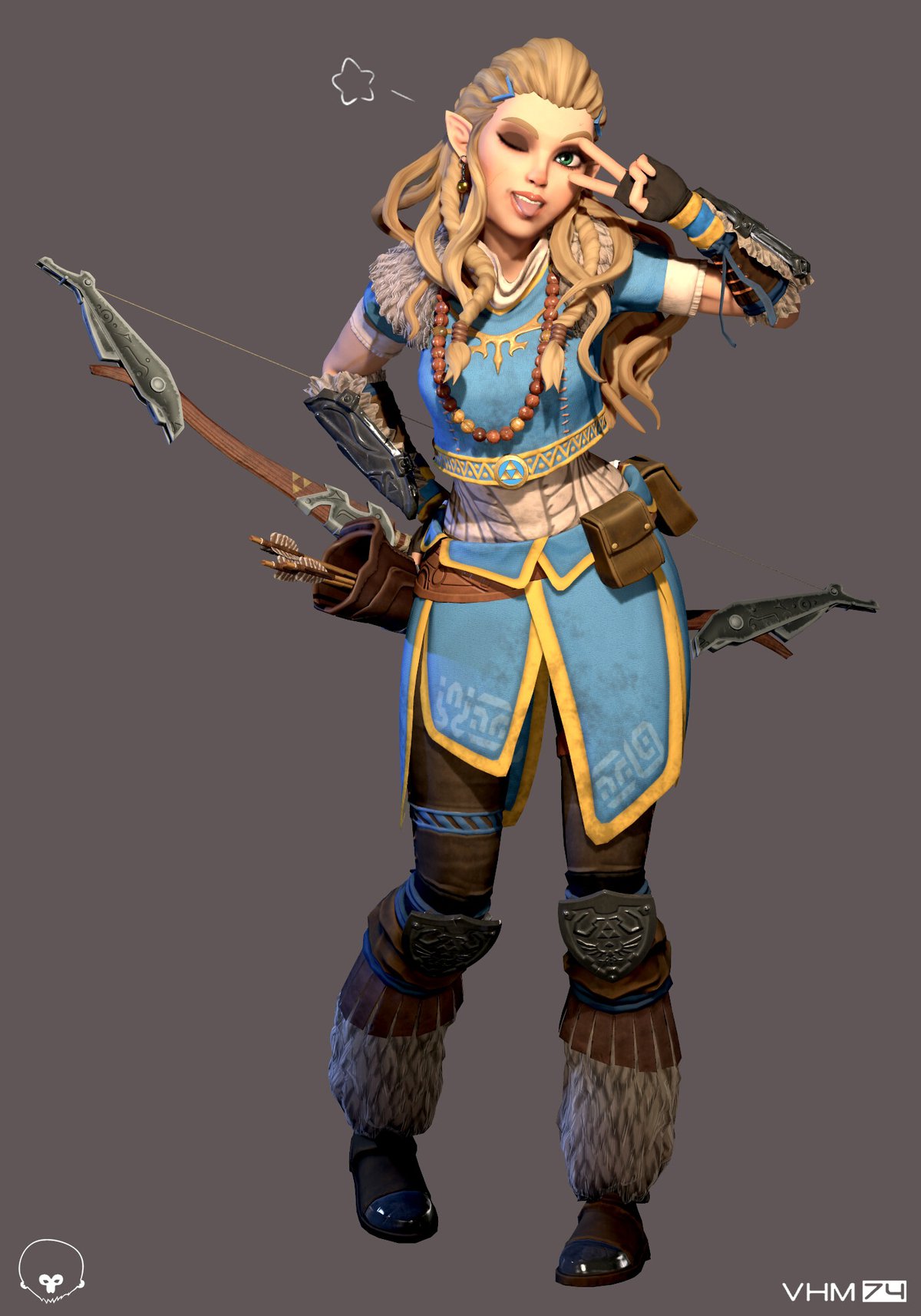 От Зельды принцессе досталось лицо, ушки и одежда синего цвета, от Элой — прическа, аксессуары, дизайн костюма и лук. Получилось сурово и в то же время очень мило: смесь Зельды и Элой оказалась симпатичной.