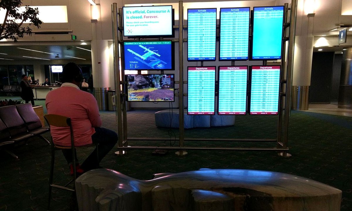Молодой мужчина, ожидавший своего рейса в аэропорту Портленда, решил скоротать время и сыграть в Apex Legends. В качестве монитора он использовал один из экранов информационной системы аэропорта — видимо, входы экрана не были заблокированы.