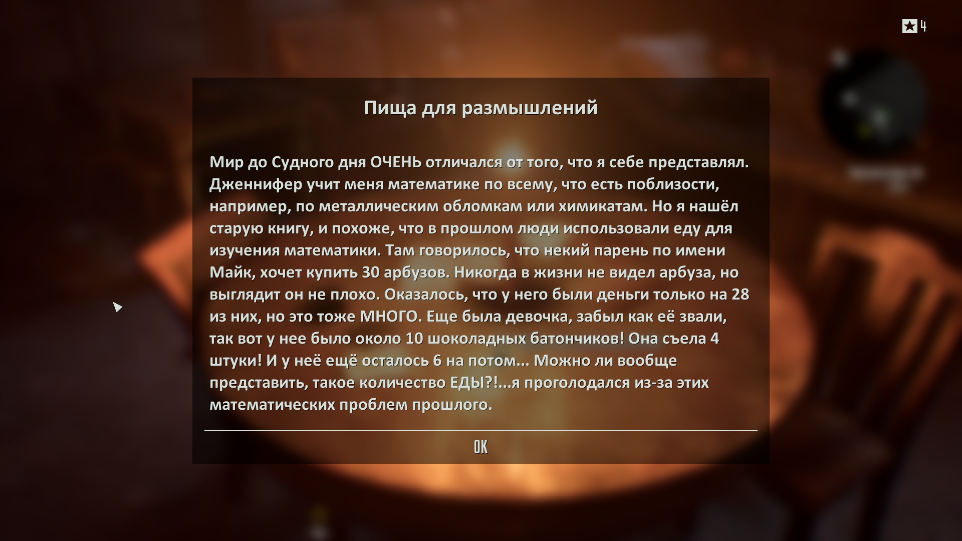 Игра, через персонажей и жителей убежищ (их тут не одно), показывает, какого это жить в уничтоженном ядерным ударом мире, где в спину постоянно стреляют роботы, которые не знают, что такое усталость и сожаление. Тут показано то, как ребёнок, который родился в этом мире, радуется простым вещам, которые были до войны, как удивляется загадкам школьной программы про Петю с 10-тью арбузами. Даже задаётся вопросом: неужели, до войны, было так много еды?!