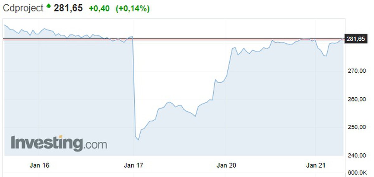 На данный момент акции CD Projekt торгуются на Варшавской бирже по 281.65 злотых, или около $73.6. К моменту закрытия торгов в день переноса Cyberpunk 2077 — биржа закрылась до анонса новой даты выхода — цена акции холдинга достигала 282.3 злотых, или примерно $73.79.