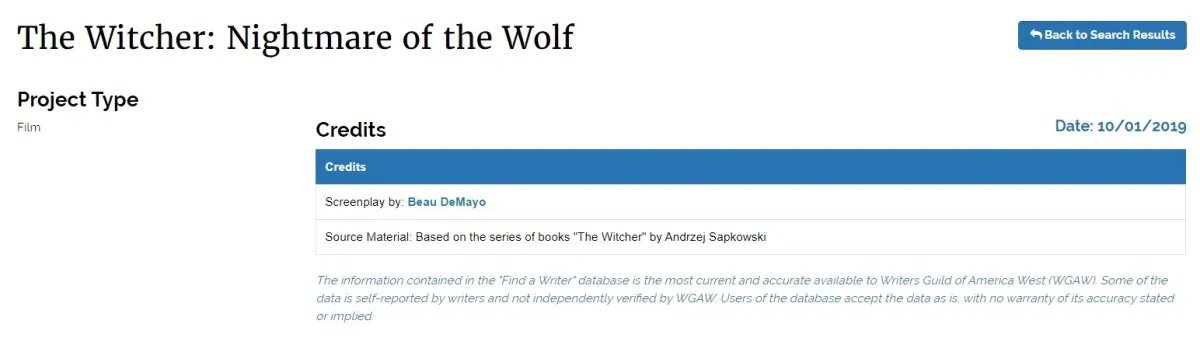 Согласно данным Гильдии, сценаристом проекта выступил Бо ДеМайо, написавший сценарий одного из эпизодов первого сезона «Ведьмака». Кроме того, ДеМайо принимает участие в работе над вторым сезоном сериала.