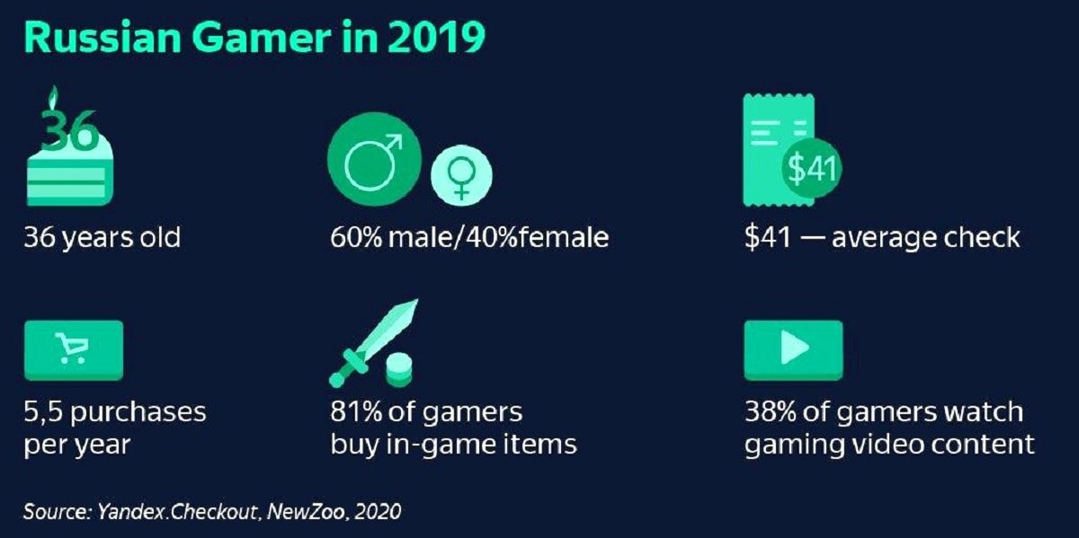 По оценке компании, среднему российскому игроку 36 лет, с 60% вероятностью это мужчина. В среднем он совершает 5.5 покупок в год, тратя по $41, или около 2500 рублей. 81% игроков покупают внутриигровые предметы, 38% смотрят игровой видеоконтент.