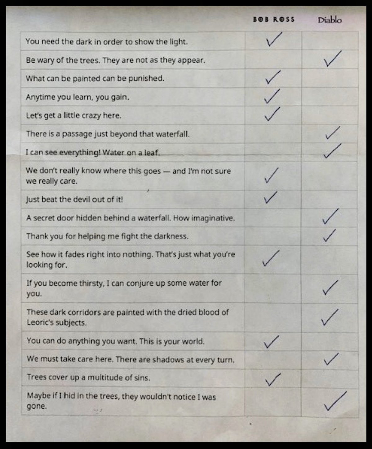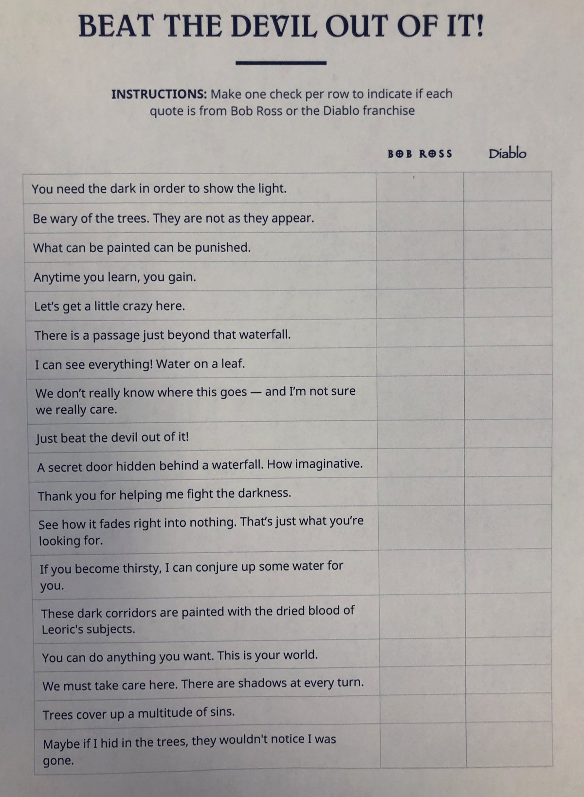 Разработчикам-участникам предлагалось определить, кому принадлежат несколько зловеще-дьявольских цитат. Они могли быть взяты либо из игр вселенной Diablo, либо из роликов Боба Росса, известного художника-популяризатора живописи.