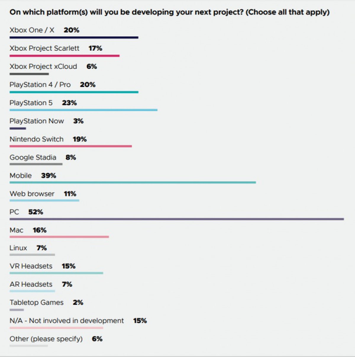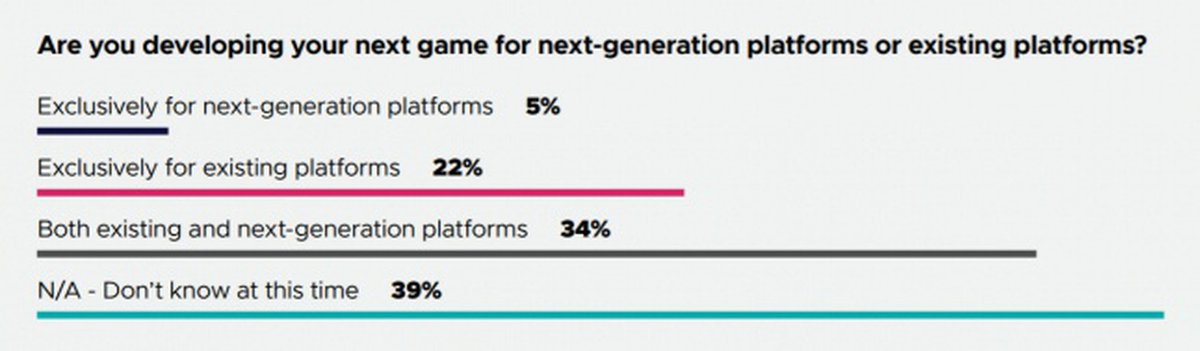 Примечательно, что только 5% разработчиков рассказали, что будут работать над эксклюзивами для консолей нового поколения или одной из уже существующих платформ. При этом 22% будут делать эксклюзивы для нынешних платформ, а 34% займутся играми и для нового, и для нынешнего поколения.