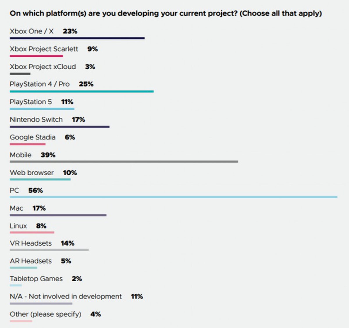 Самой популярной платформой по-прежнему остаются PC и мобильные устройства, затем идут PlayStation 4 и Xbox One, а также их модификации. Интересно, что по числу проектов PlayStation 5 обходит Xbox нового поколения.
